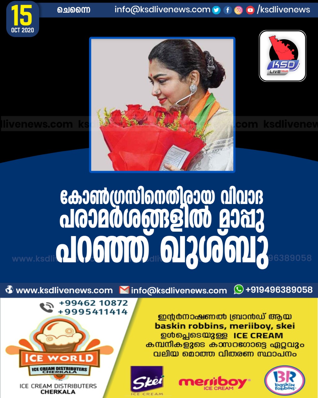 കോൺഗ്രസിനെതിരായ വിവാദ പരാമർശങ്ങളിൽ മാപ്പു പറഞ്ഞ് ഖുശ്ബു