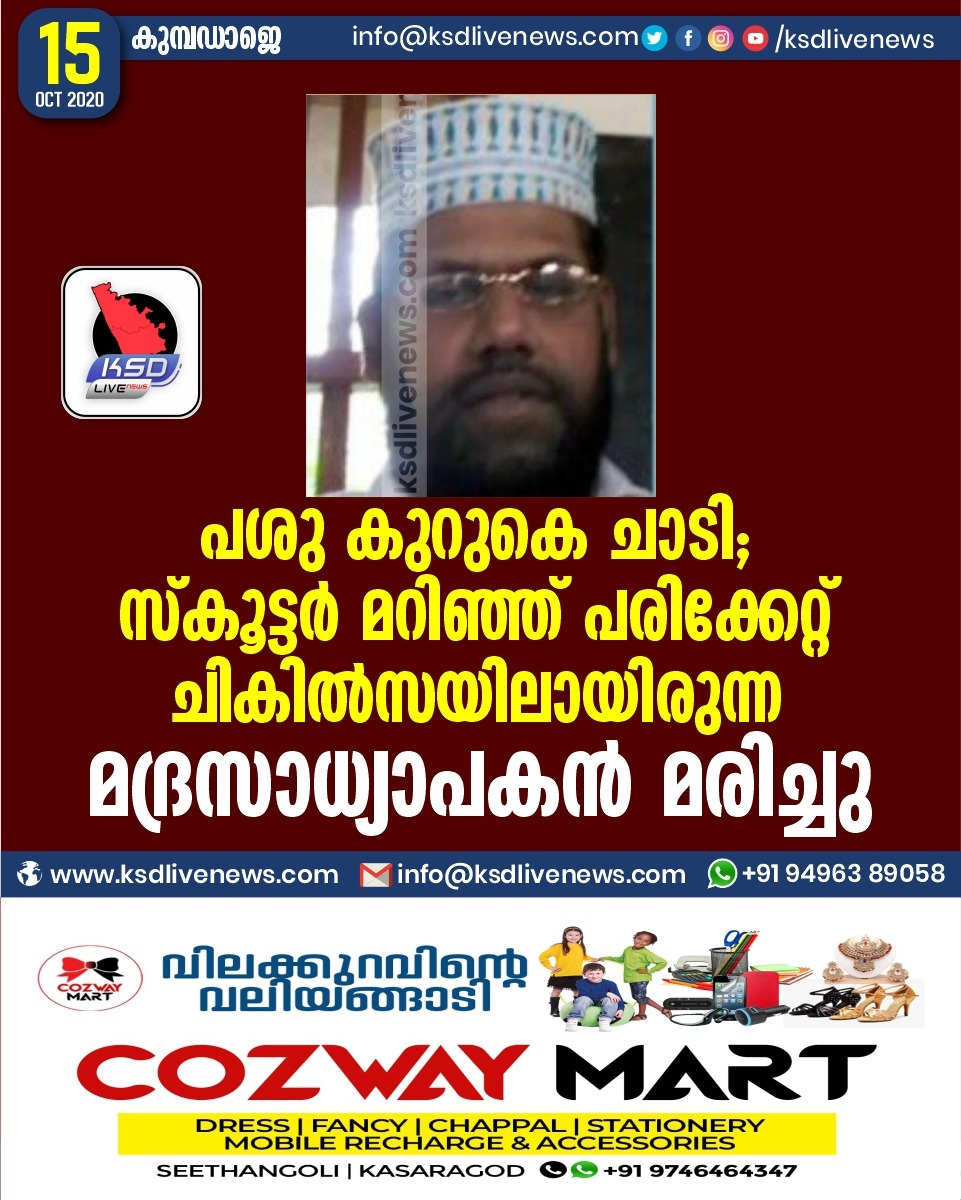 പ്രാദേശികം പശു കുറുകെ ചാടി; സ്കൂട്ടര് മറിഞ്ഞ് പരിക്കേറ്റ് ചികിൽസയിലായിരുന്ന മദ്രസാധ്യാപകന് മരിച്ചുOctober 15, 2020