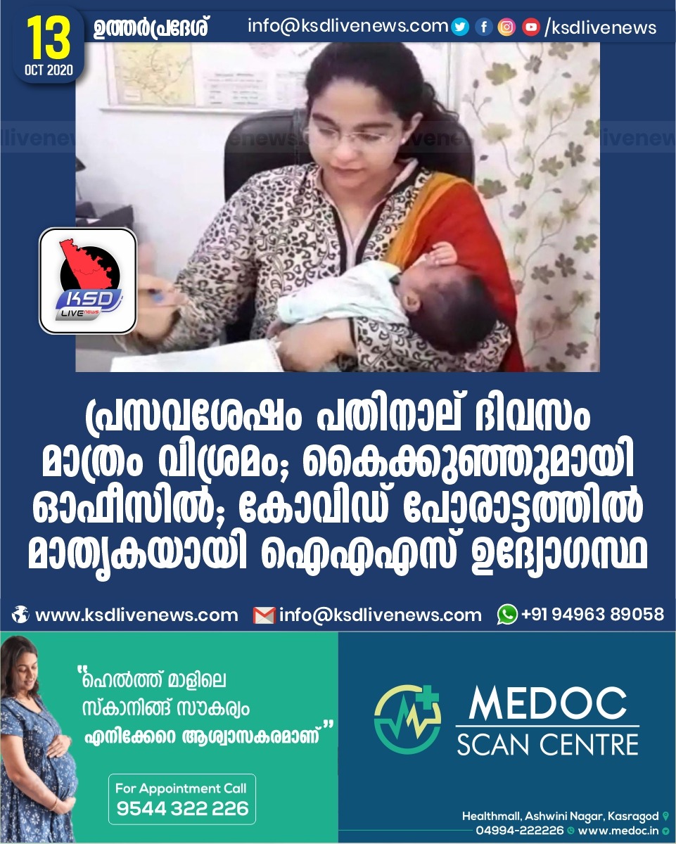 ദേശീയം പ്രസവശേഷം പതിനാല് ദിവസം മാത്രം വിശ്രമം ; കൈക്കുഞ്ഞുമായി ഓഫീസിൽ ; കോവിഡ് പോരാട്ടത്തിൽ മാതൃകയായി ഐഎഎസ് ഉദ്യോഗസ്ഥOctober 13, 2020