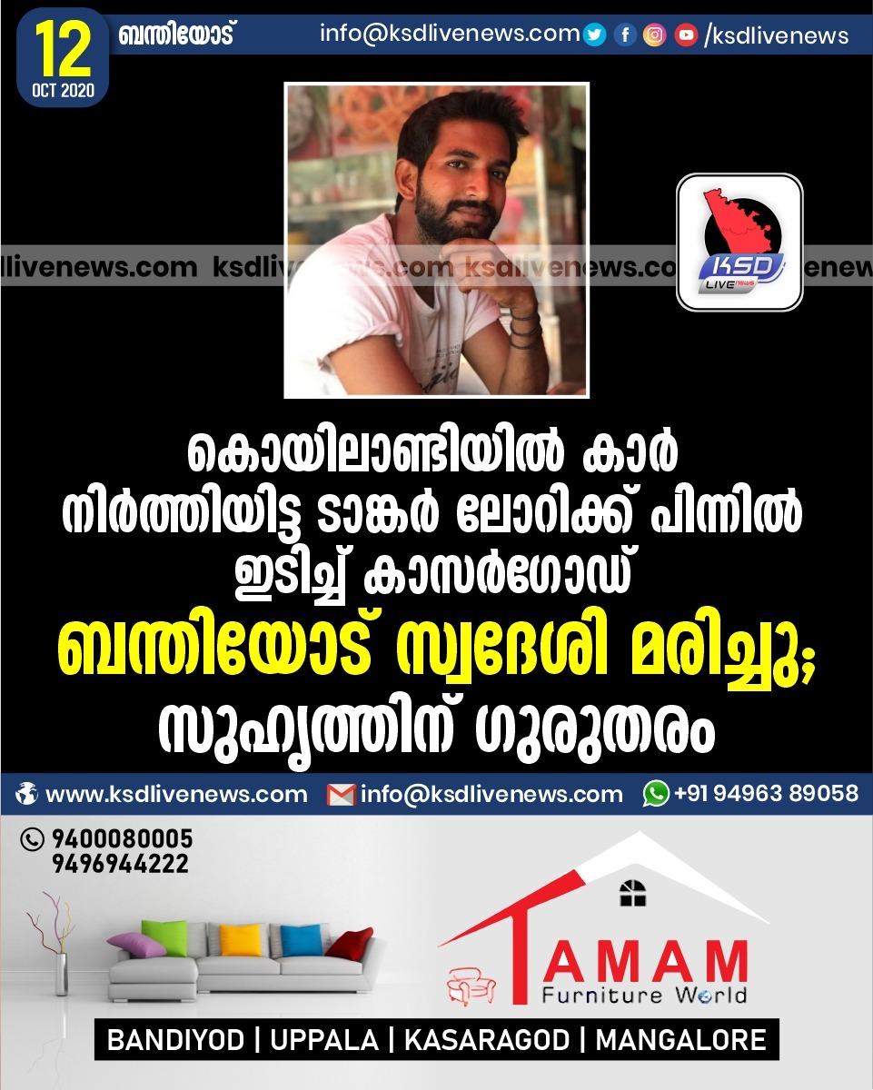 പ്രാദേശികം കൊയിലാണ്ടിയില് കാര് നിർത്തിയിട്ട ടാങ്കര് ലോറിക്ക് പിന്നില് ഇടിച്ച് കാസർഗോഡ് ബന്തിയോട് സ്വദേശി മരിച്ചു ; സുഹൃത്തിന് ഗുരുതരംOctober 12, 2020