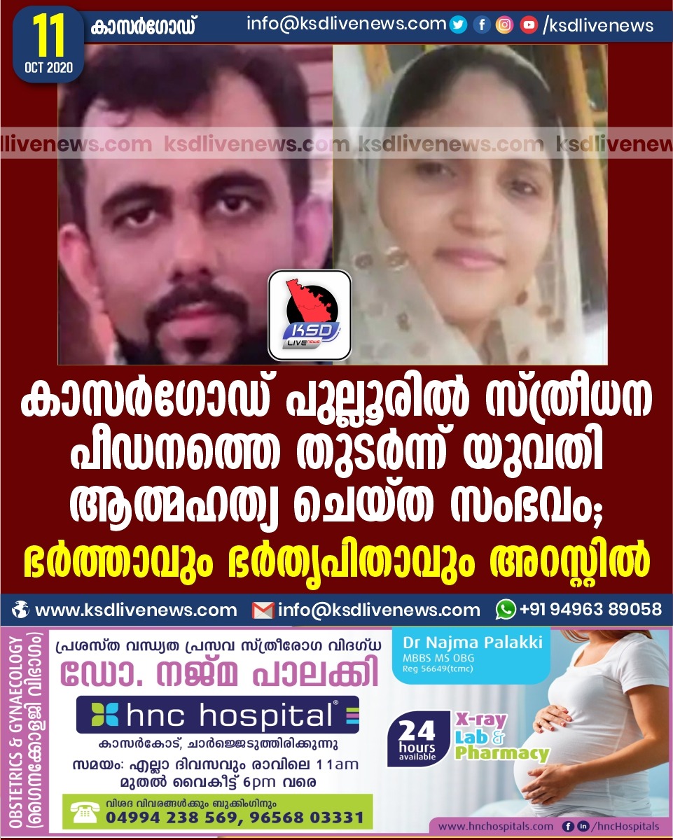 പ്രാദേശികം കാസർഗോഡ് പുല്ലൂരില് സ്ത്രീധന പീഡനത്തെ തുടര്ന്ന് യുവതി ആത്മഹത്യ ചെയ്ത സംഭവം ; ഭര്ത്താവും ഭര്തൃപിതാവും അറസ്റ്റില്October 11, 2020