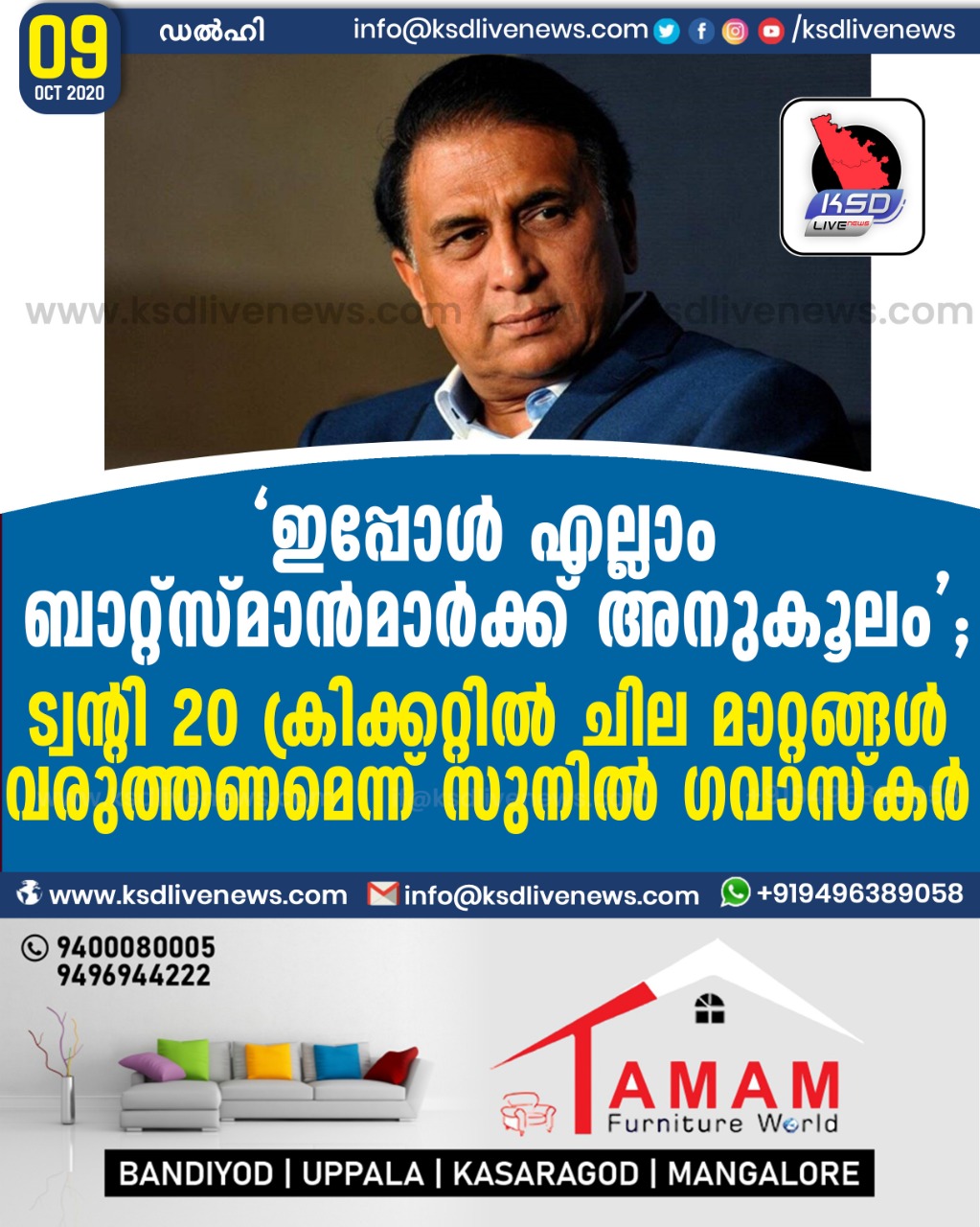 ദേശീയം ‘ ഇപ്പോൾ എല്ലാം ബാറ്റ്സ്മാൻമാർക്ക് അനുകൂലം ‘ ; ട്വന്റി 20 ക്രിക്കറ്റിൽ ചില മാറ്റങ്ങൾ വരുത്തണമെന്ന് സുനിൽ ഗവാസ്കർOctober 9, 2020