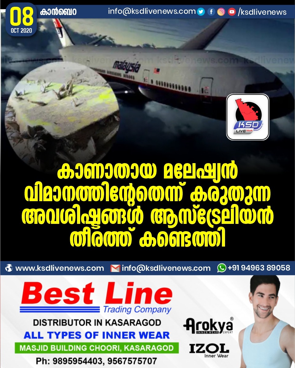 വിദേശം കാണാതായ മലേഷ്യൻ വിമാനത്തിന്റേതെന്ന് കരുതുന്ന അവശിഷ്ടങ്ങൾ ആസ്ട്രേലിയൻ തീരത്ത് കണ്ടെത്തിOctober 8, 2020