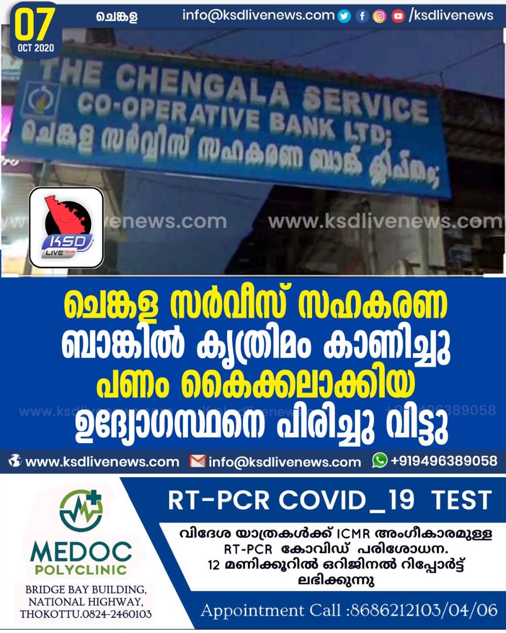 പ്രാദേശികം ചെങ്കള സർവീസ് സഹകരണ ബാങ്കിൽ കൃത്രിമം കാണിച്ചു പണം കൈക്കലാക്കിയ ഉദ്യോഗസ്ഥനെ പിരിച്ചു വിട്ടുOctober 7, 2020