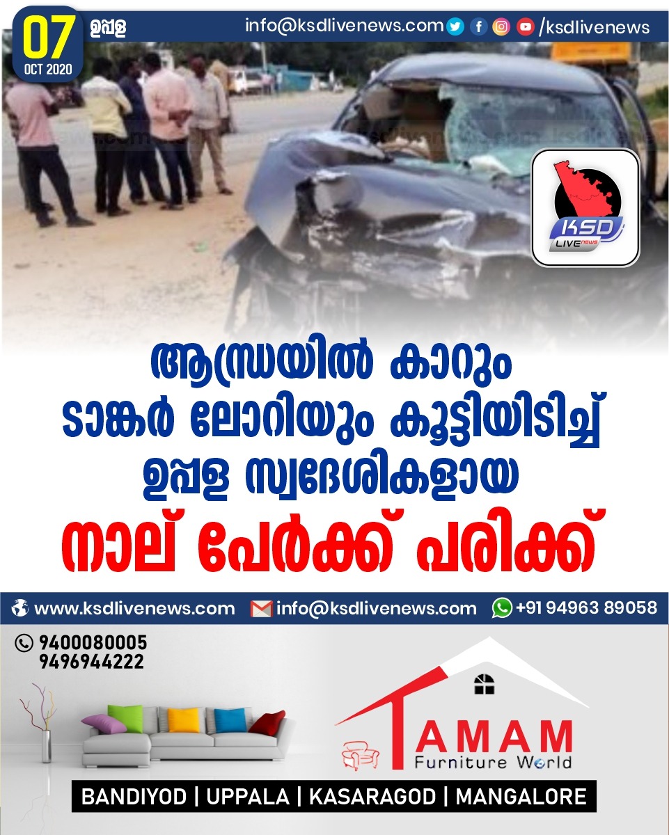 പ്രാദേശികം ആന്ധ്രയില് കാറും ടാങ്കര് ലോറിയും കൂട്ടിയിടിച്ച് ഉപ്പള സ്വദേശികളായ നാല് പേർക്ക് പരിക്ക്October 7, 2020