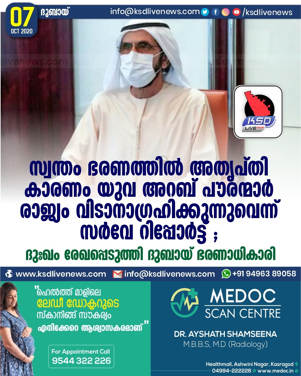 വിദേശം സ്വന്തം ഭരണത്തിൽ അതൃപ്തി കാരണം യുവ അറബ് പൗരന്മാർ രാജ്യം വിടാനാഗ്രഹിക്കുന്നുവെന്ന് സർവേ റിപ്പോർട്ട് ;ദുഃഖം രേഖപ്പെടുത്തി ദുബായ് ഭരണാധികാരിOctober 7, 2020