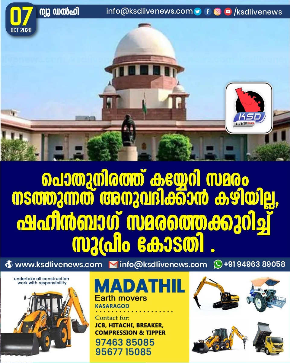 ദേശീയം പൊതുനിരത്ത് കയ്യേറി സമരം നടത്തുന്നത് അനുവദിക്കാൻ കഴിയില്ല , ഷഹീൻബാഗ് സമരത്തെക്കുറിച്ച് സുപ്രീം കോടതി .October 7, 2020