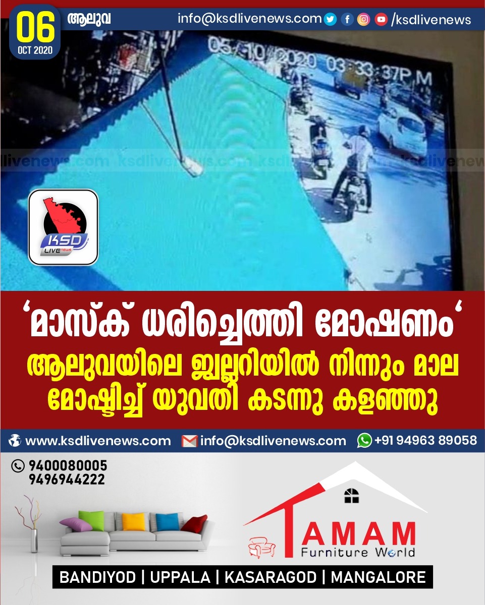 പ്രാദേശികം “മാസ്ക് ധരിച്ചെത്തി മോഷണം” ആലുവയിലെ ജ്വല്ലറിയിൽ നിന്നും മാല മോഷ്ടിച്ച് യുവതി കടന്നു കളഞ്ഞുOctober 6, 2020