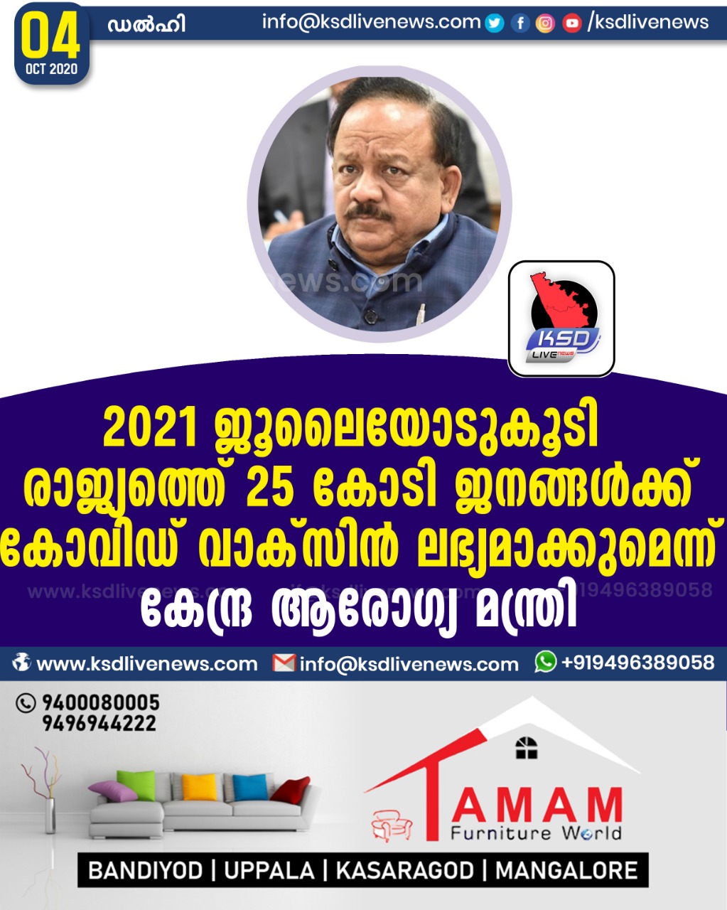 ദേശീയം 2021 ജൂലൈയോടുകൂടി രാജ്യത്തെ 25 കോടി ജനങ്ങൾക്ക് കോവിഡ് വാക്സിൻ ലഭ്യമാക്കുമെന്ന് കേന്ദ്ര ആരോഗ്യ മന്ത്രിOctober 4, 2020