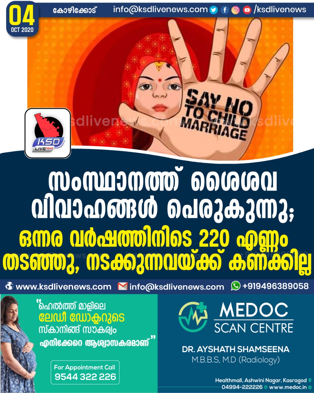 കേരളം സംസ്ഥാനത്ത് ശൈശവ വിവാഹങ്ങൾ പെരുകുന്നു ; ഒന്നര വർഷത്തിനിടെ 220 എണ്ണം തടഞ്ഞു, നടക്കുന്നവയ്ക്ക് കണക്കില്ലOctober 4, 2020
