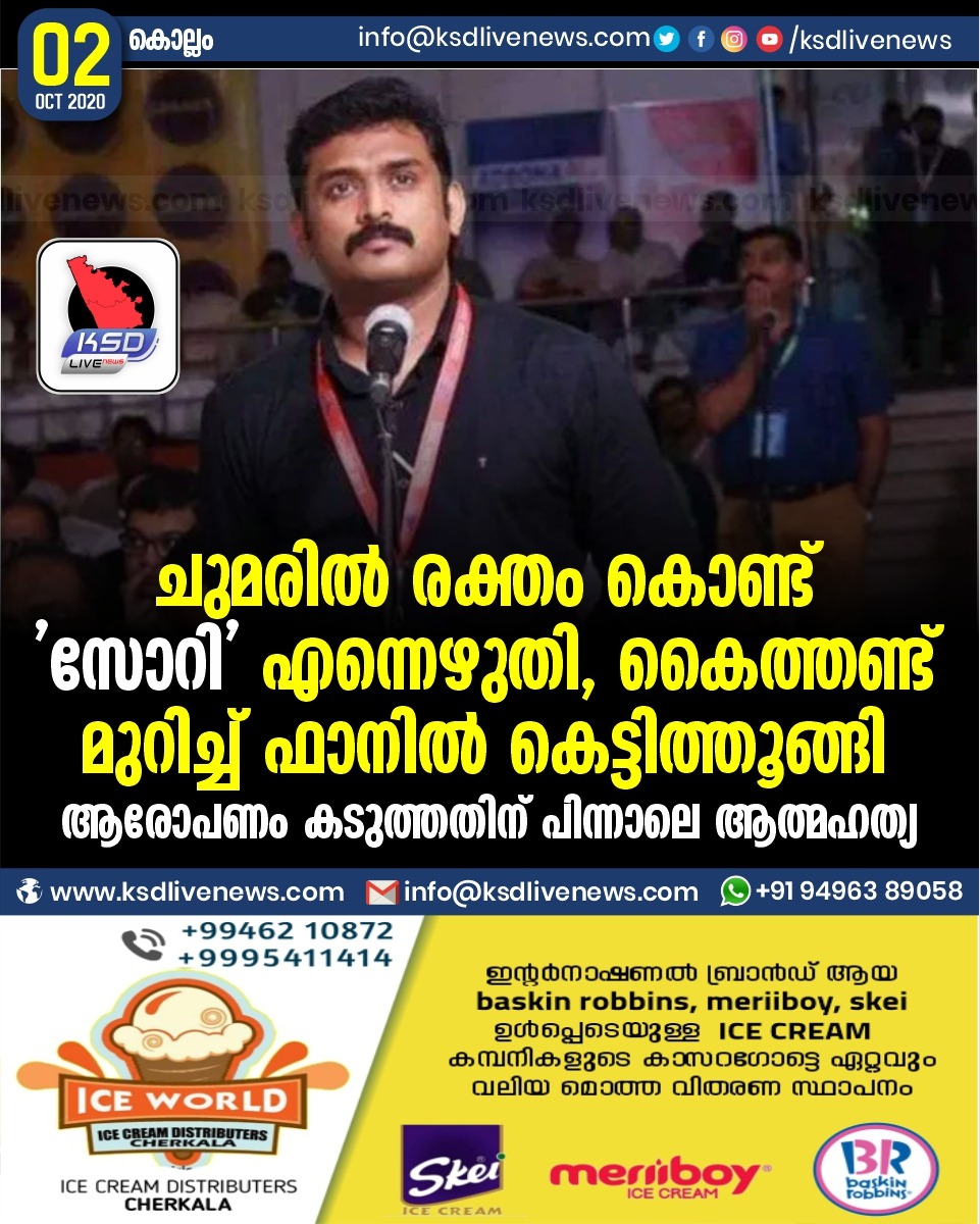 കേരളം ചുമരിൽ രക്തം കൊണ്ട് ‘ സോറി ‘ എന്നെഴുതി , കൈത്തണ്ട് മുറിച്ച് ഫാനിൽ കെട്ടിത്തൂങ്ങി ; ആരോപണം കടുത്തതിന് പിന്നാലെ ആത്മഹത്യOctober 2, 2020
