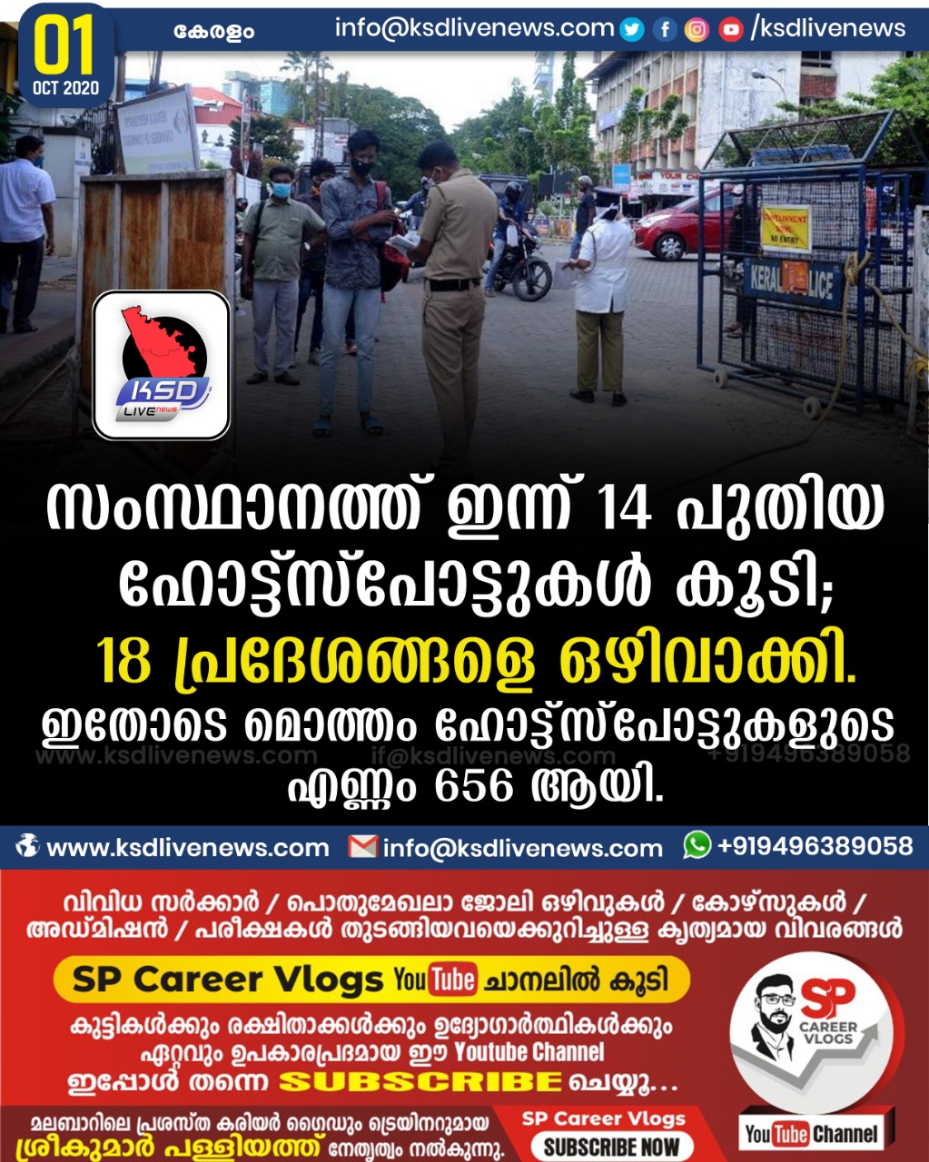 കേരളം സംസ്ഥാനത്ത് ഇന്ന് 14 പുതിയ ഹോട്ട്സ്പോട്ടുകള് കൂടി; 18 പ്രദേശങ്ങളെ ഒഴിവാക്കി.ഇതോടെ മൊത്തം ഹോട്ട്സ്പോട്ടുകളുടെ എണ്ണം 656 ആയി.October 1, 2020