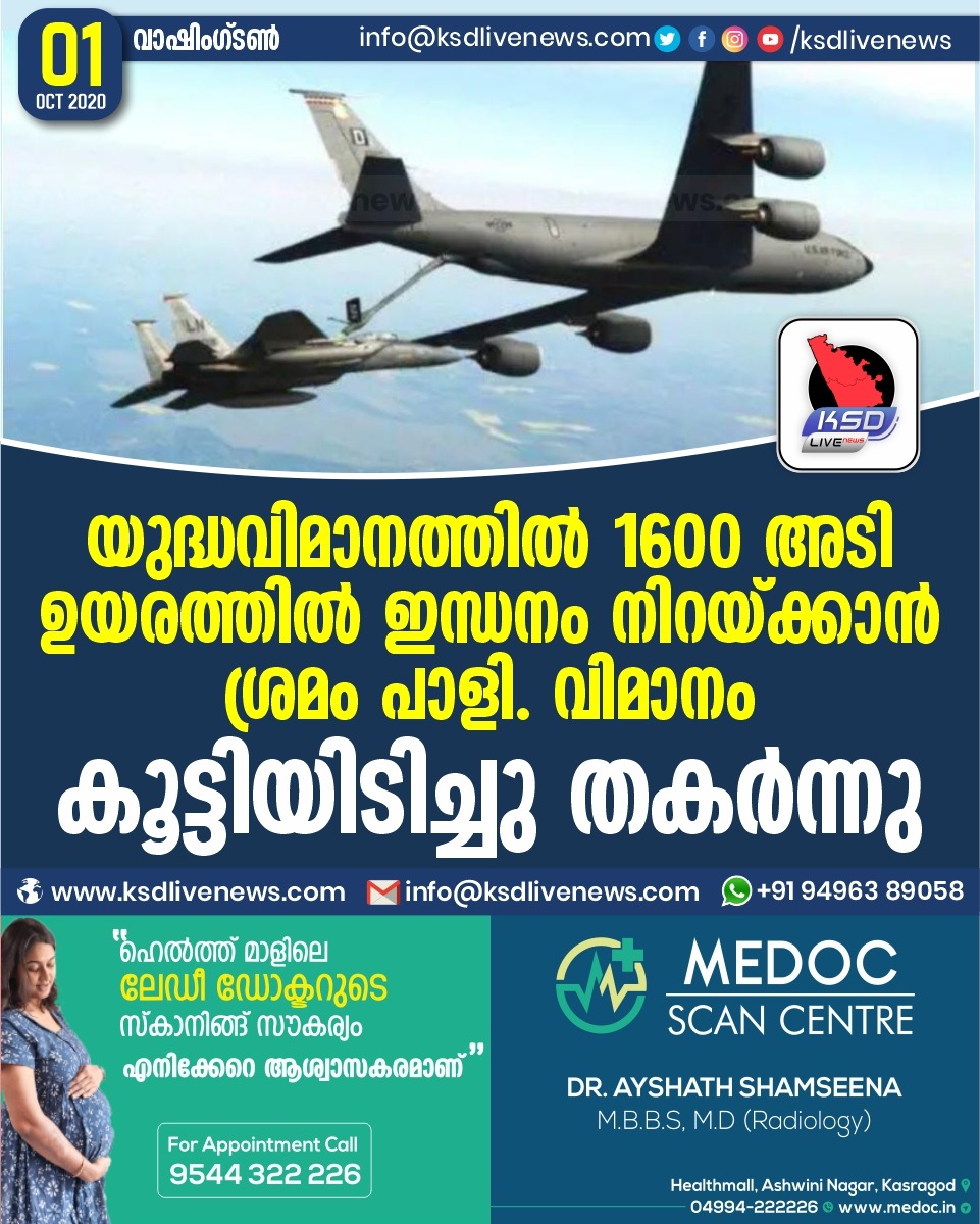 വിദേശം യുദ്ധവിമാനത്തിൽ 1600 അടി ഉയരത്തിൽ ഇന്ധനം നിറയ്ക്കാൻ ശ്രമം പാളി. വിമാനം കൂട്ടിയിടിച്ചു തകർന്നുOctober 1, 2020