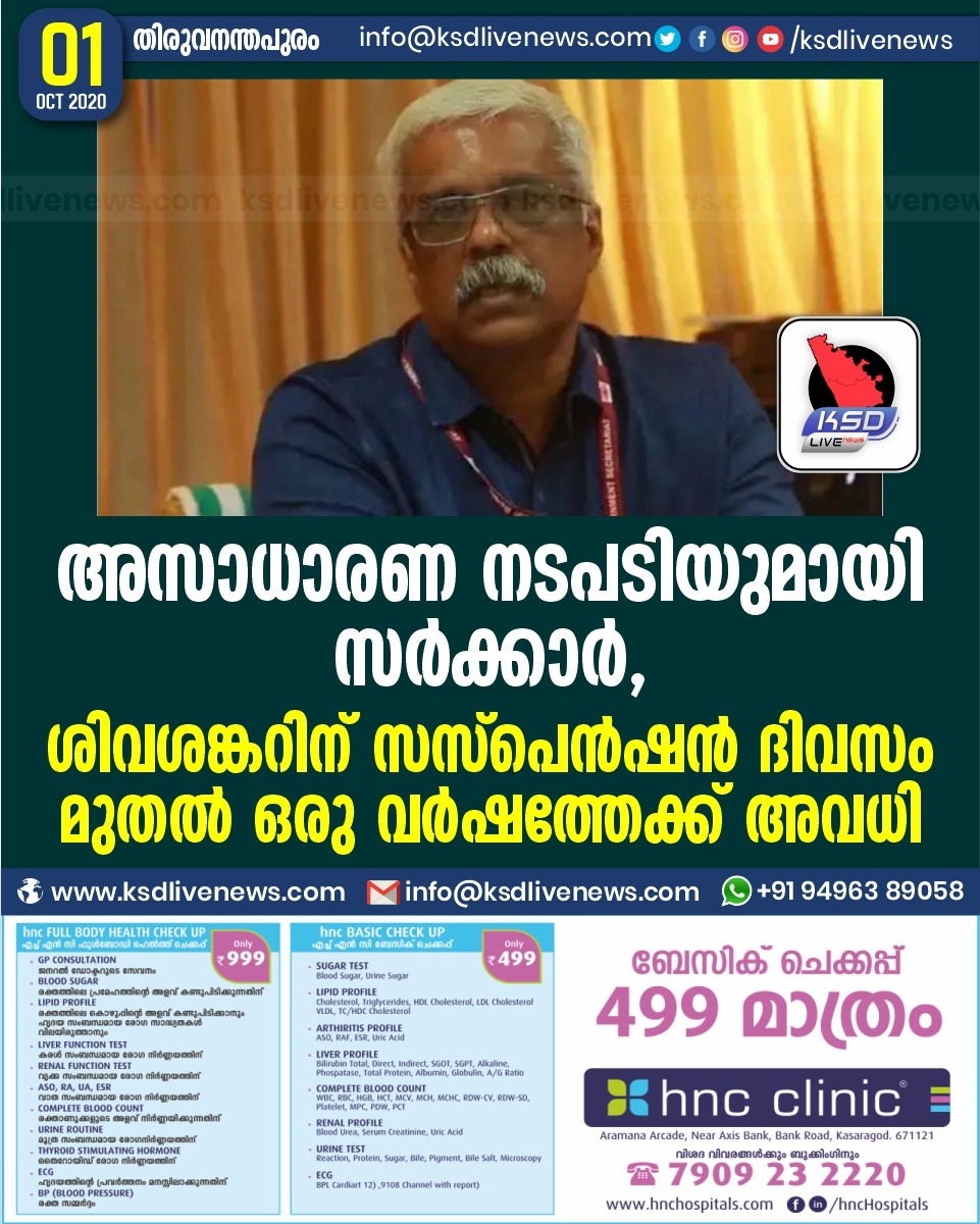 കേരളം അസാധാരണ നടപടിയുമായി സർക്കാർ , ശിവശങ്കറിന് സസ്പെൻഷൻ ദിവസം മുതൽ ഒരു വർഷത്തേക്ക് അവധിOctober 1, 2020