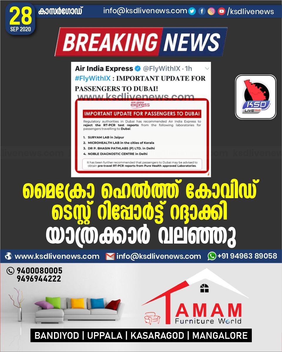 ദേശീയംപ്രാദേശികം മൈക്രോ ഹെൽത്ത് കോവിഡ് ടെസ്റ്റ് റിപ്പോർട്ട് റദ്ദാക്കി , യാത്രക്കാർ വലഞ്ഞുSeptember 28, 2020