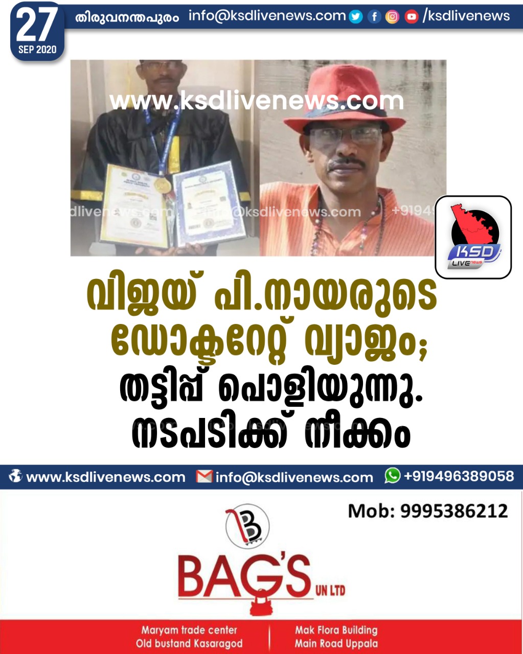 കേരളം വിജയ് പി.നായരുടെ ഡോക്ടറേറ്റ് വ്യാജം ; തട്ടിപ്പ് പൊളിയുന്നു . നടപടിക്ക് നീക്കംSeptember 27, 2020