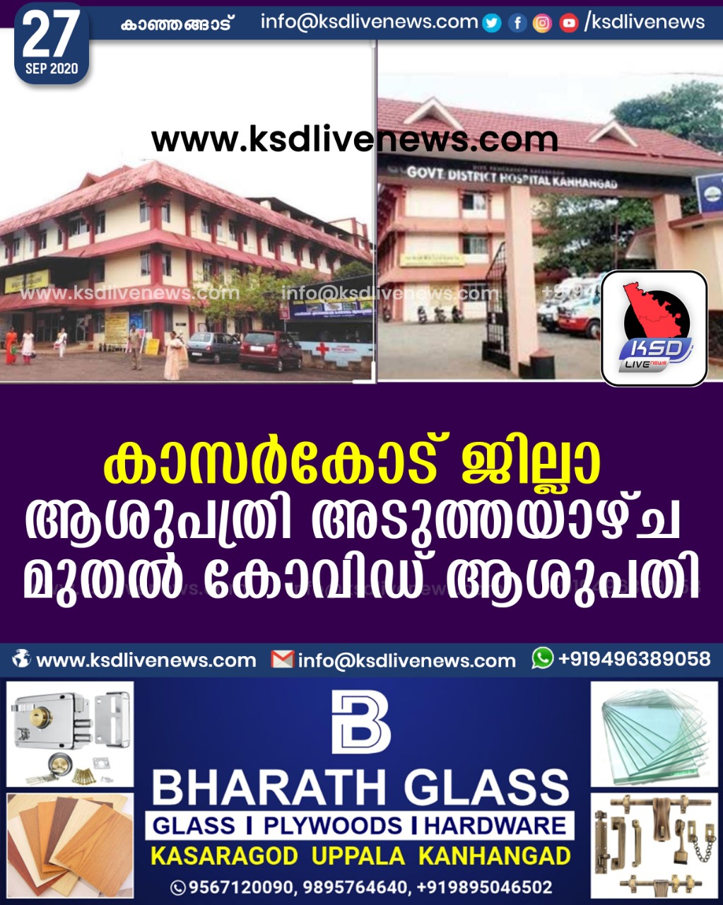 പ്രാദേശികം കാസർകോട് ജില്ലാ ആശുപത്രി അടുത്തയാഴ്ച മുതൽ കോവിഡ് ആശുപത്രിSeptember 27, 2020
