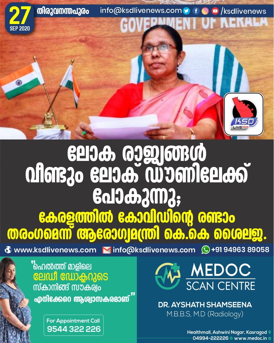 കേരളം ലോക രാജ്യങ്ങൾ വീണ്ടും ലോക് ഡൗണിലേക്ക് പോകുന്നു ;കേരളത്തില് കോവിഡിന്റെ രണ്ടാം തരംഗമെന്ന് ആരോഗ്യമന്ത്രി കെ.കെ ശൈലജ.September 27, 2020