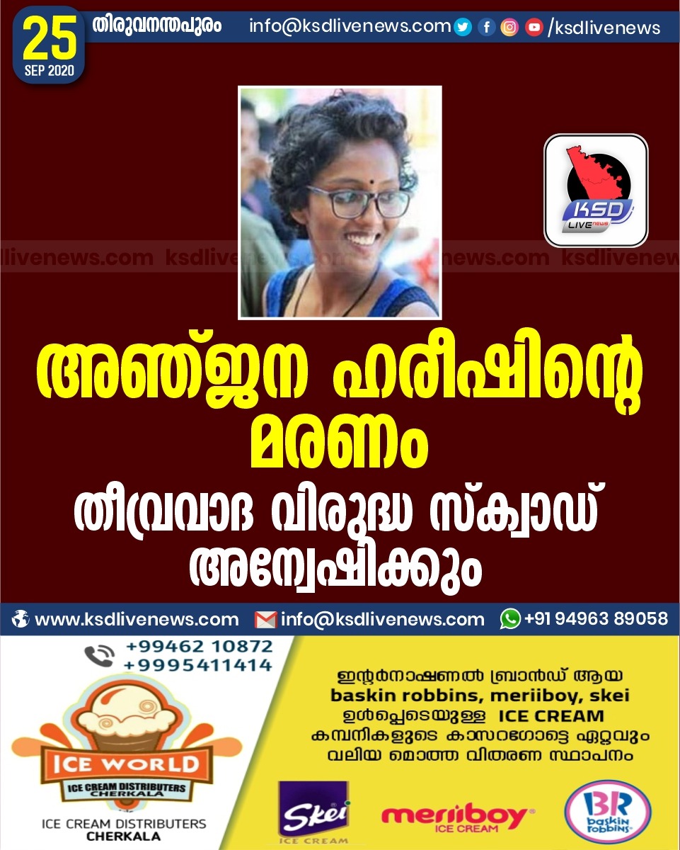 അഞ്ജന ഹരീഷിന്റെ മരണം ; തീവ്രവാദ വിരുദ്ധ സ്ക്വാഡ് അന്വേഷിക്കും