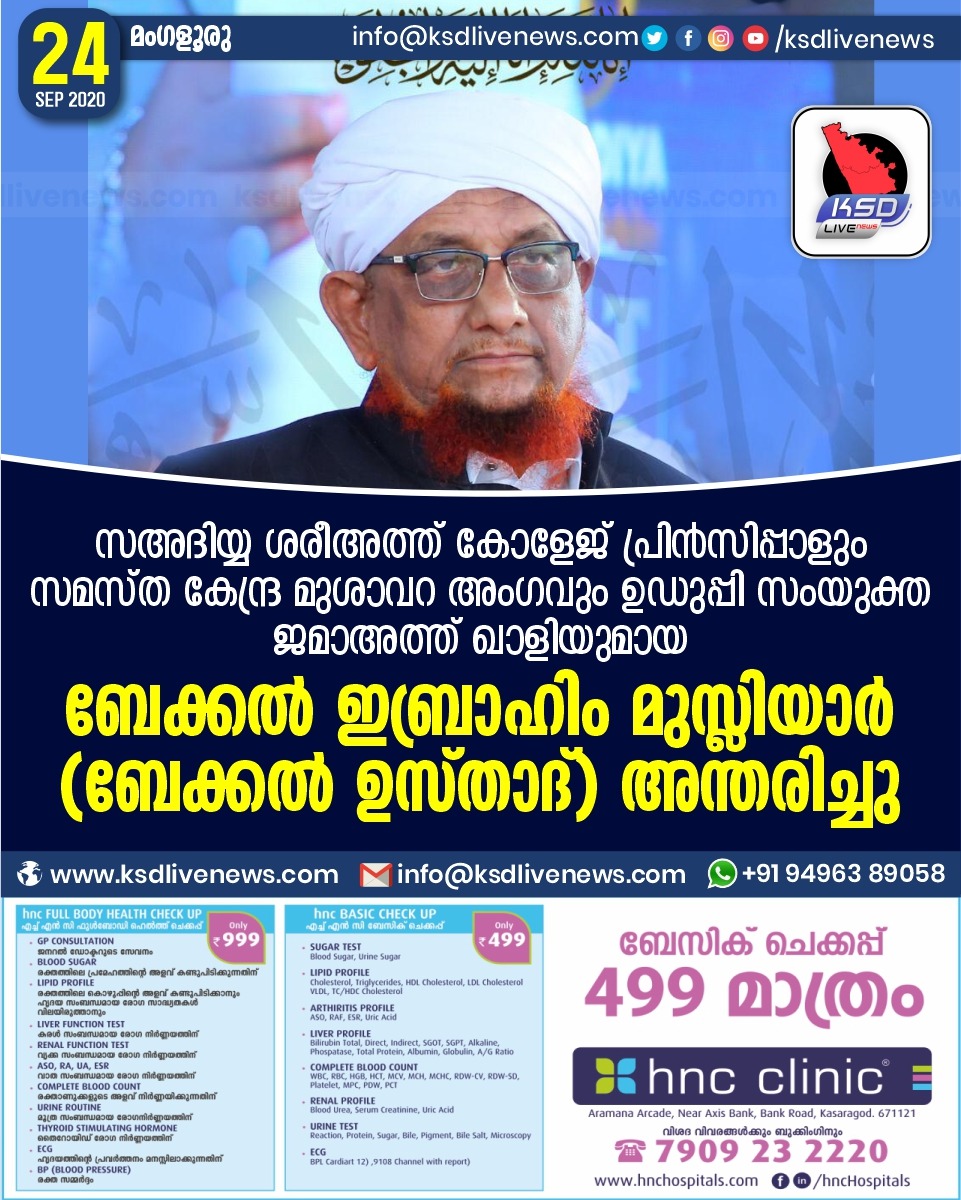 കേരളംപ്രാദേശികം സഅദിയ്യ ശരീഅത്ത് കോള്ളേജ് പ്രിൻസിപ്പാളും, സമസ്ത കേന്ദ്ര മുശാവറ അംഗവും, ഉഡുപ്പി സംയുക്ത ജമാഅത്ത് ഖാളിയുമായബേക്കൽ ഇബ്രാഹിം മുസ്ലിയാർ (ബേക്കൽ ഉസ്താദ്) അന്തരിച്ചുSeptember 24, 2020