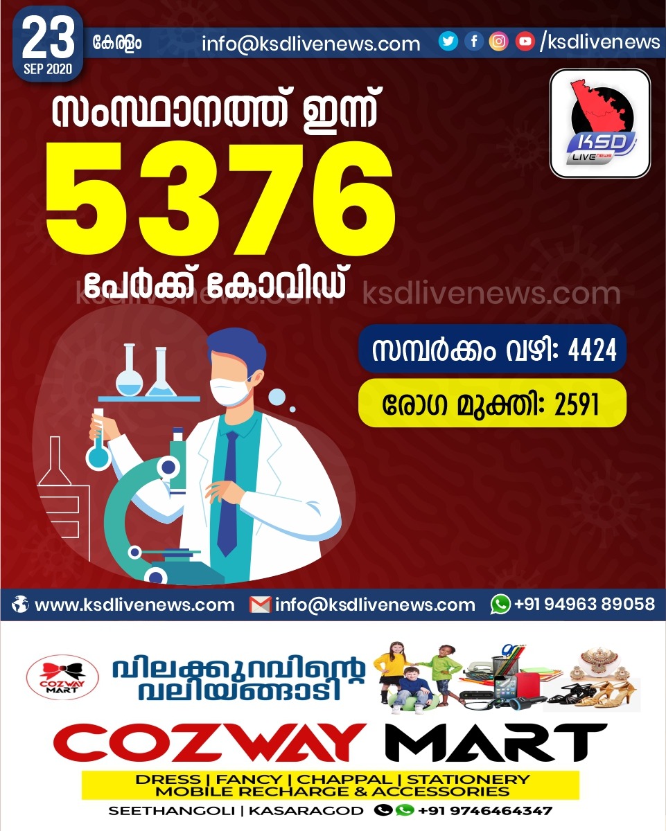 കേരളം ഇന്ന് കോവിഡ് പ്രതിദിന കണക്ക് അഞ്ചായിരം കടന്നു :സംസ്ഥാനത്ത് ഇന്ന് 5376 പേർക്ക് കോവിഡ് സ്ഥിരീകരിച്ചു. സമ്പർക്കം വഴി 4424 പേർക്കും.രോഗ മുക്തി 2591 പേർക്കും. കോവിഡ് സ്ഥിരീകരിച്ചു. മരണം 20September 23, 2020