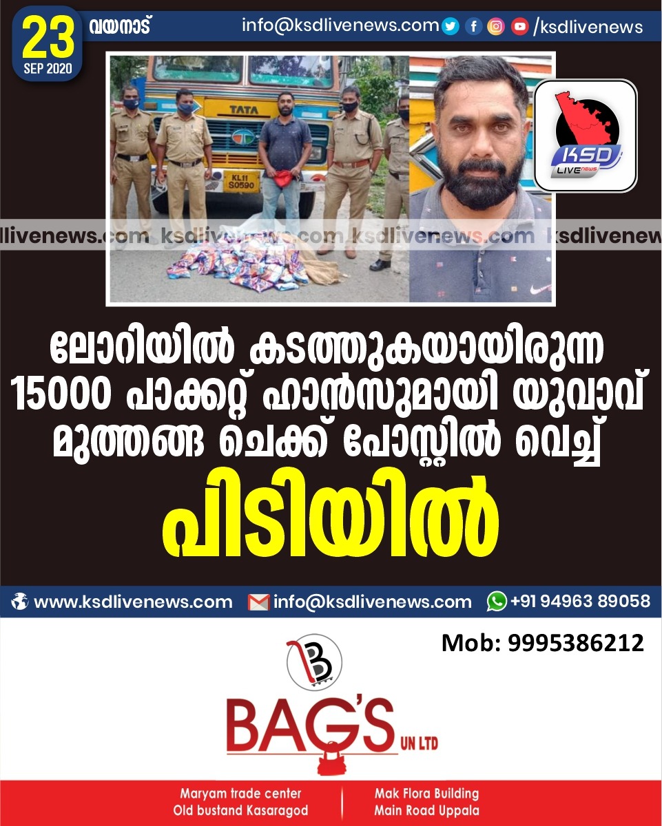 കേരളം ലോറിയിൽ കടത്തുകയായിരുന്ന 15000 പാക്കറ്റ് ഹാൻസുമായി യുവാവ് മുത്തങ്ങ ചെക്ക് പോസ്റ്റിൽ വെച്ച് പിടിയിൽSeptember 23, 2020