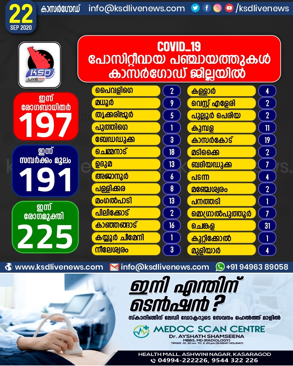 പ്രാദേശികം കാസർഗോഡ് ജില്ലയിൽ ഇന്ന് കോവിഡ് പോസിറ്റീവായവരുടെ പഞ്ചായത്ത് തിരിച്ചുള്ള സ്ഥിതി വിവര കണക്ക്September 22, 2020