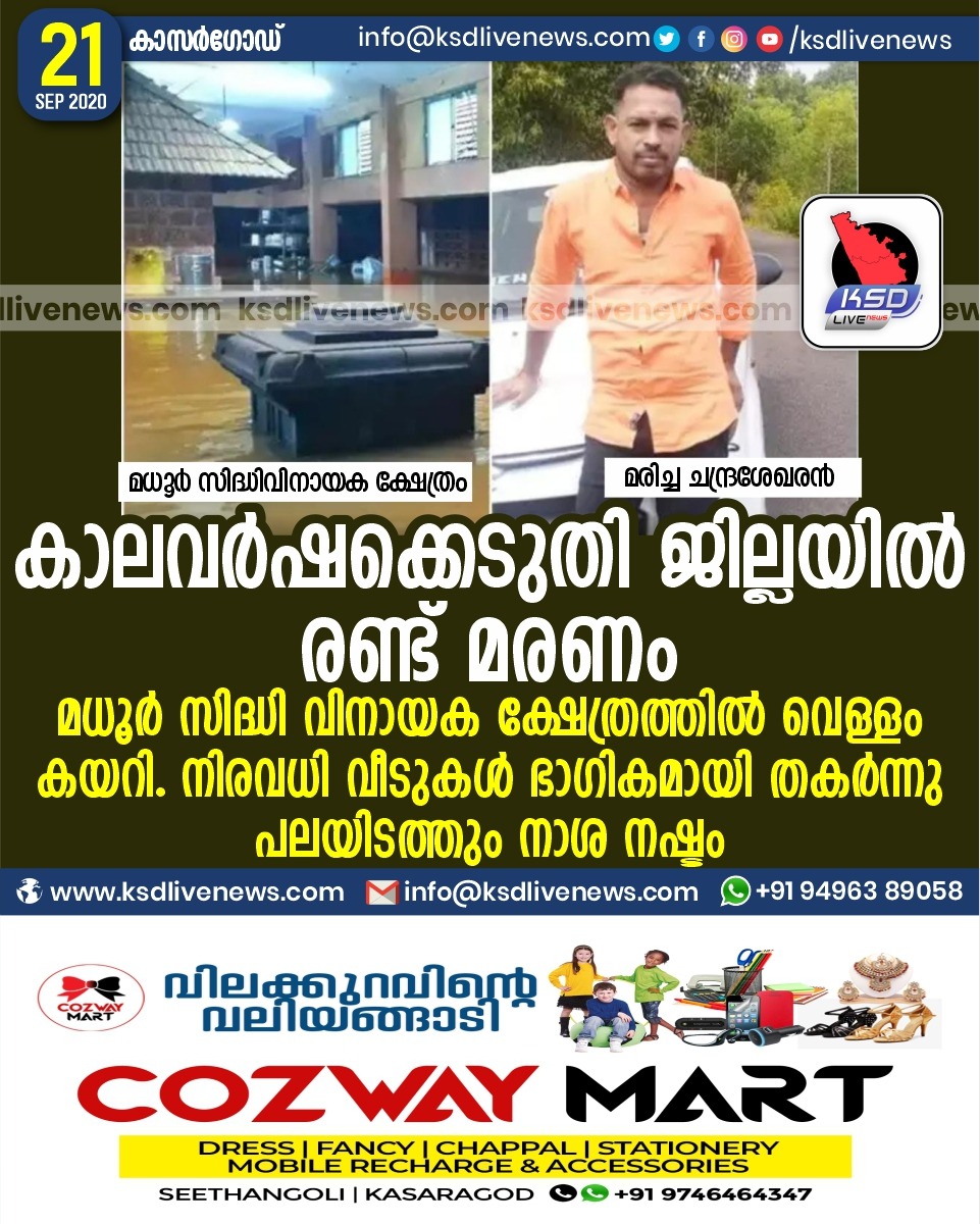 പ്രാദേശികം കാലവർഷക്കെടുതി ജില്ലയിൽ രണ്ട് മരണം ;മധൂർ സീദ്ധി വിനായക ക്ഷേത്രത്തിൽ വെള്ളം കയറിനിരവധി വീടുകൾ ഭാഗികമായി തകർന്നു ;പലയിടത്തും നാശ നഷ്ടംSeptember 21, 2020