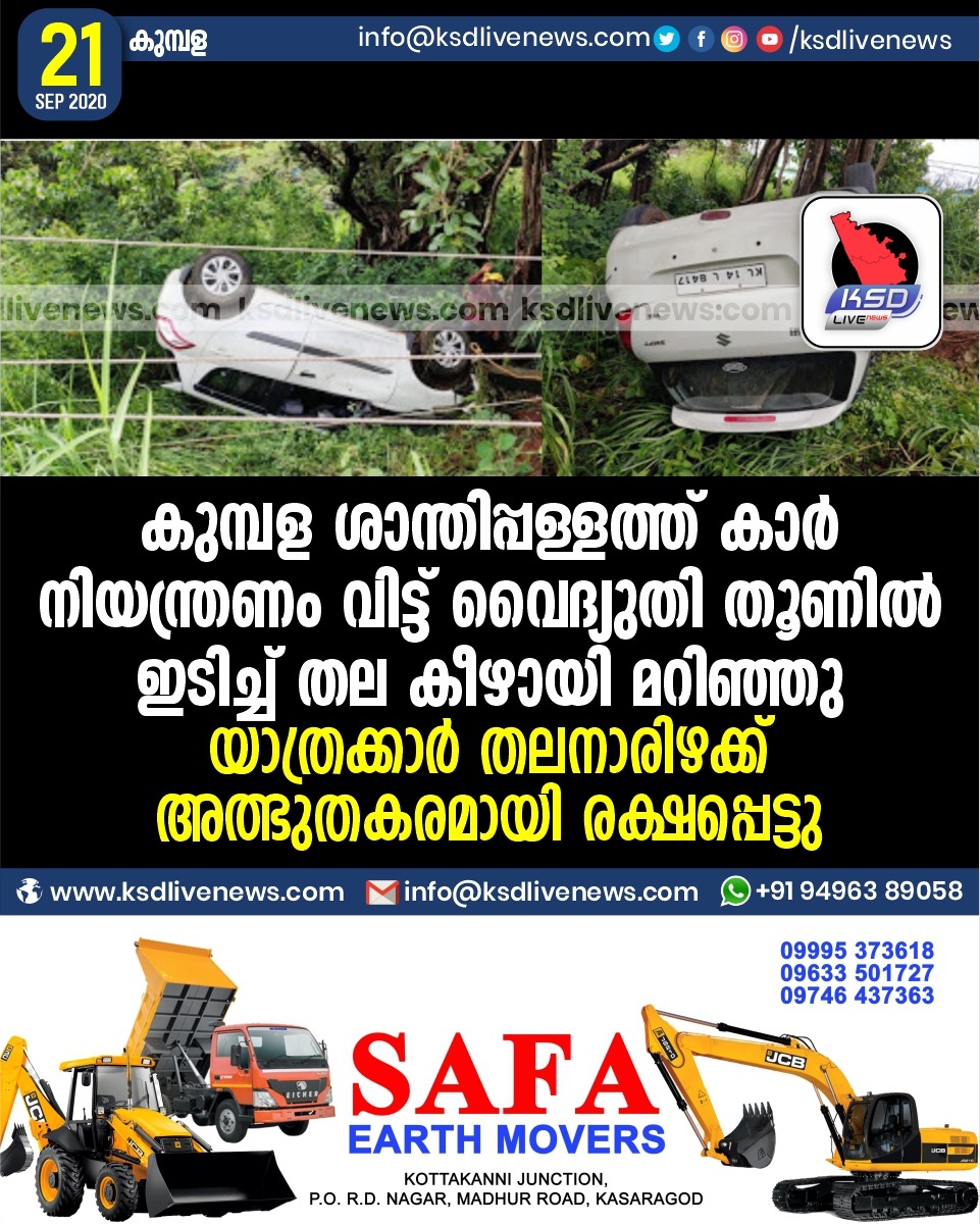 പ്രാദേശികം കുമ്പള ശാന്തിപ്പള്ളത്ത് കാർ നിയന്ത്രണം വിട്ട് വൈദ്യുതി തൂണിൽ ഇടിച്ച് തല കീഴായി മറിഞ്ഞു ;യാത്രക്കാർ തലനാരിഴക്ക് അത്ഭുതകരമായി രക്ഷപ്പെട്ടുSeptember 21, 2020