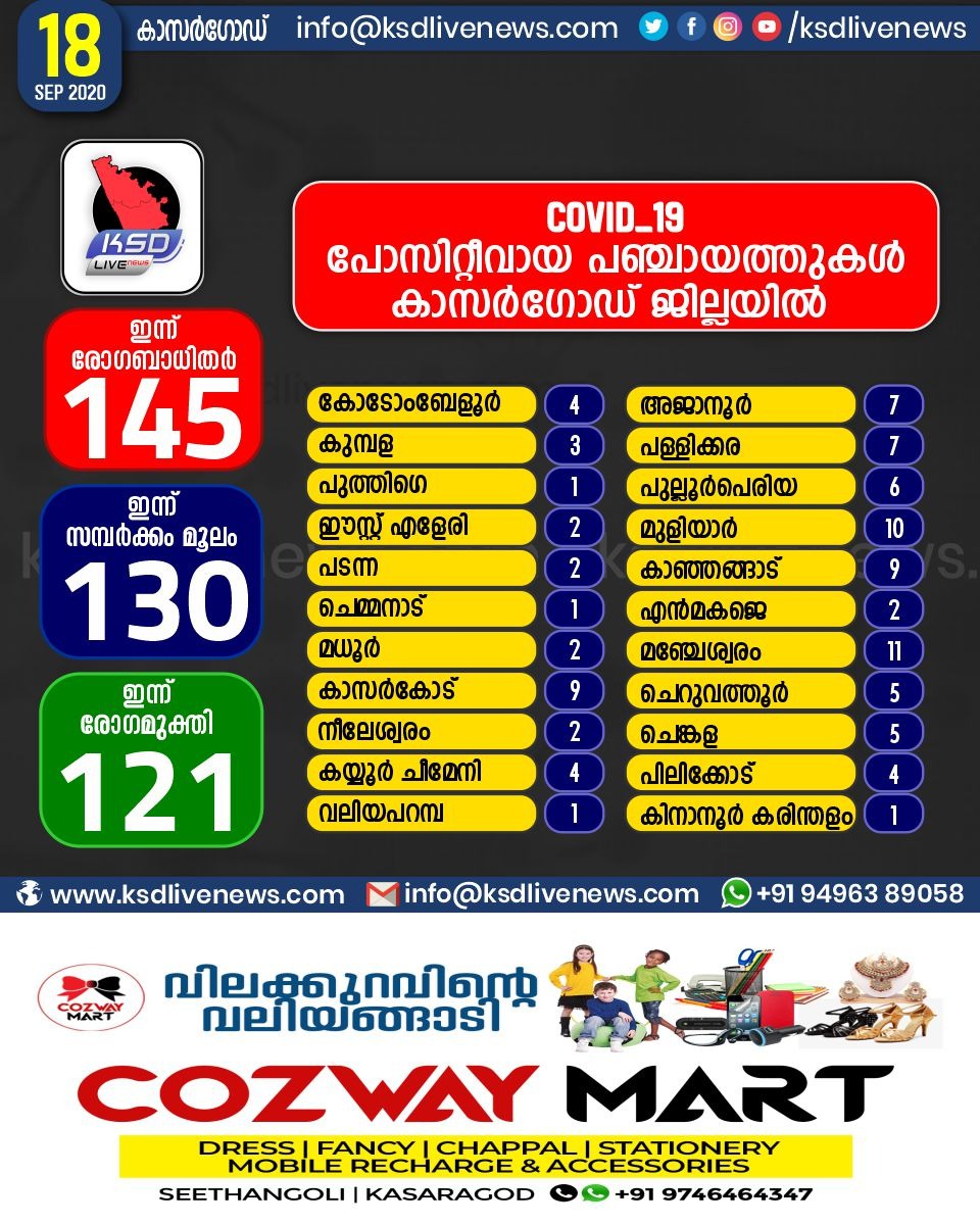 പ്രാദേശികം കാസർഗോഡ് ജില്ലയിൽ ഇന്ന് കോവിഡ് പോസിറ്റീവായവരുടെ പഞ്ചായത്ത് തിരിച്ചുള്ള സ്ഥിതി വിവര കണക്ക്September 18, 2020
