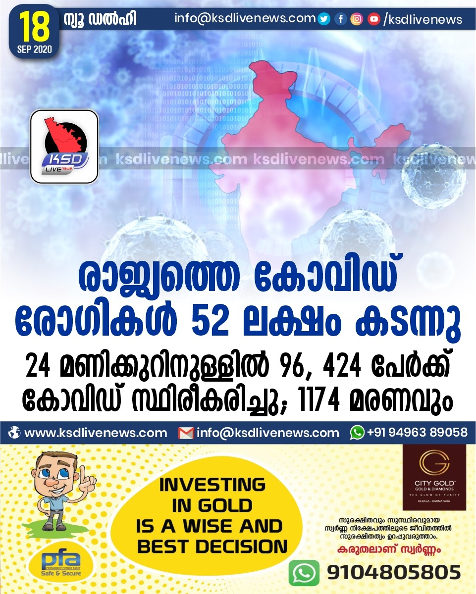ദേശീയം രാജ്യത്തെ കോവിഡ് രോഗികൾ 52 ലക്ഷം കടന്നു : 24 മണിക്കുറിനുള്ളിൽ 96, 424 പേർക്ക് കോവിഡ് സ്ഥിരീകരിച്ചു ; 1174 മരണവുംSeptember 18, 2020