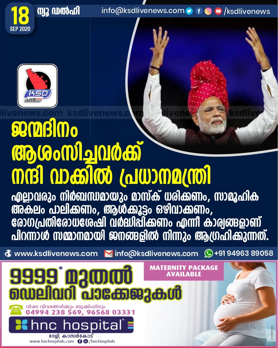 ദേശീയം ജന്മദിനം ആശംസിച്ചവർക്ക് നന്ദി വാക്കിൽ പ്രധാനമന്ത്രി ;എല്ലാവരും നിര്ബന്ധമായും മാസ്ക് ധരിക്കണം, സാമൂഹിക അകലം പാലിക്കണം, ആള്ക്കൂട്ടം ഒഴിവാക്കണം, രോഗപ്രതിരോധശേഷി വര്ദ്ധിപ്പിക്കണം എന്നീ കാര്യങ്ങളാണ് പിറന്നാള് സമ്മാനമായി ജനങ്ങളില് നിന്നും ആഗ്രഹിക്കുന്നത്.September 18, 2020