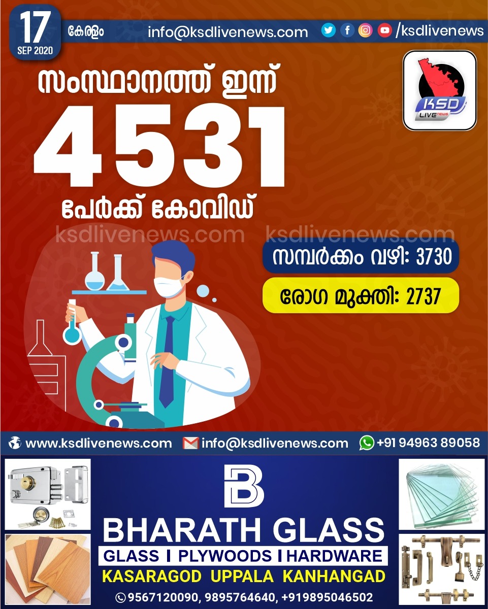 കേരളം സംസ്ഥാനത്ത് ഇന്ന് 4531 പേർക്ക് കോവിഡ് സ്ഥിരീകരിച്ചു. സമ്പർക്കം വഴി 2739 പേർക്കും.രോഗ മുക്തി 2737 പേർക്കും. ഉറവിടം അറിയാത്തത് 351; കാസർഗോഡ് ജില്ലയിൽ ഇന്ന് 319 പേർക്ക് കോവിഡ് സ്ഥിരീകരിച്ചു. മരണം 10ഇന്ന് സംസ്ഥാനത്ത് ഏറ്റവും ഉയർന്ന കോവിഡ് കണക്ക് ;September 17, 2020