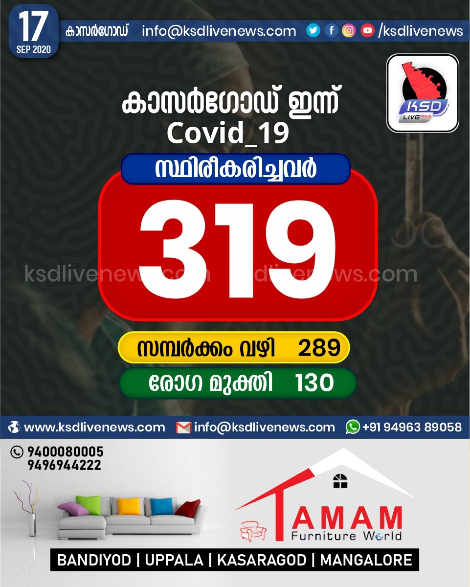 പ്രാദേശികം കാസർഗോഡ് ജില്ലയിൽ ഇന്ന് 319 പേർക്ക് കോവിഡ് സ്ഥിരീകരിച്ചു. സമ്പർക്കം വഴി 289 പേർക്കും. 130 പേർക്ക് രോഗ മുക്തിSeptember 17, 2020