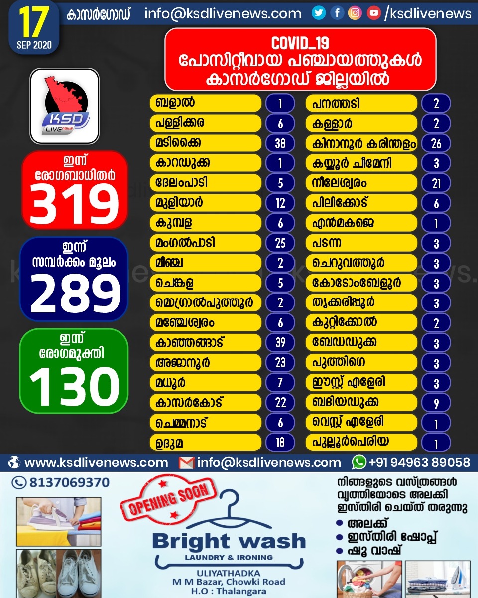 പ്രാദേശികം കാസർഗോഡ് ജില്ലയിൽ ഇന്ന് കോവിഡ് പോസിറ്റീവായവരുടെ പഞ്ചായത്ത് തിരിച്ചുള്ള സ്ഥിതി വിവര കണക്ക്September 17, 2020