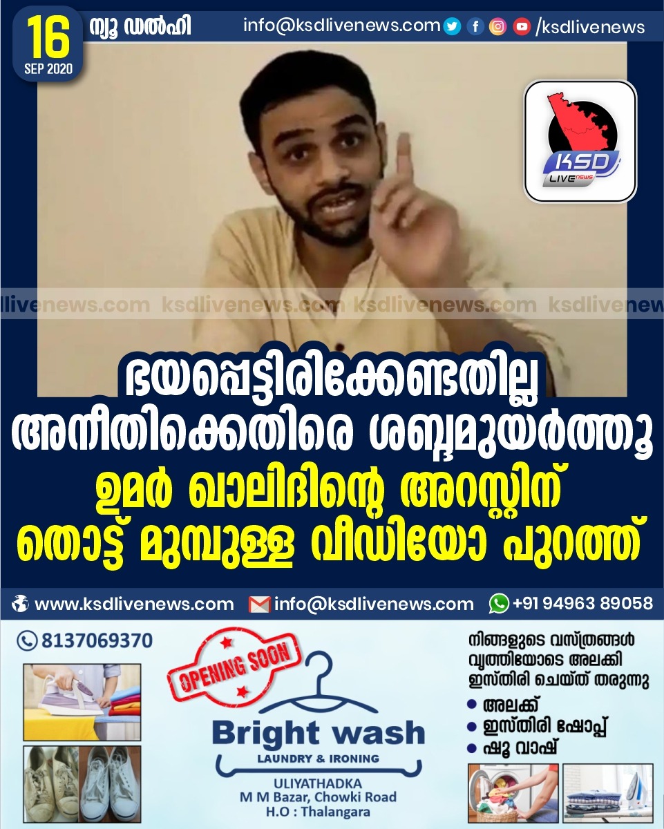 ദേശീയം ഭയപ്പെട്ടിരിക്കേണ്ടതില്ല , അനീതിക്കെതിരെ ശബ്ദമുയർത്തൂ ‘ ; ഉമർ ഖാലിദിന്റെ അറസ്റ്റിന് തൊട്ട് മുമ്പുള്ള വീഡിയോ പുറത്ത്September 16, 2020