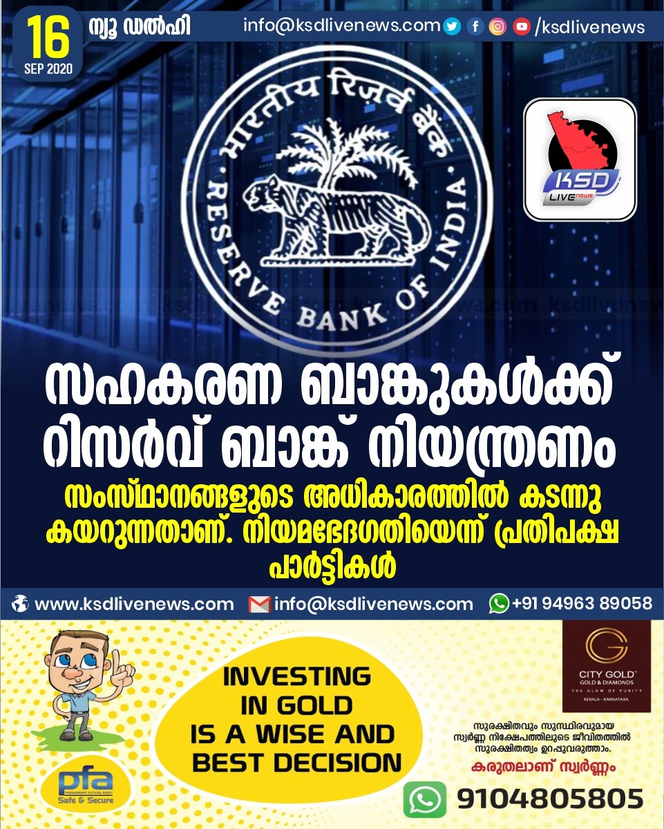 ദേശീയം സഹകരണ ബാങ്കുകൾക്ക് റിസർവ് ബാങ്ക് നിയന്ത്രണം ;സംസ്ഥാനങ്ങളുടെ അധികാരത്തില് കടന്നു കയറുന്നതാണ് നിയമഭേദഗതിയെന്ന് പ്രതിപക്ഷ പാർട്ടികൾSeptember 16, 2020