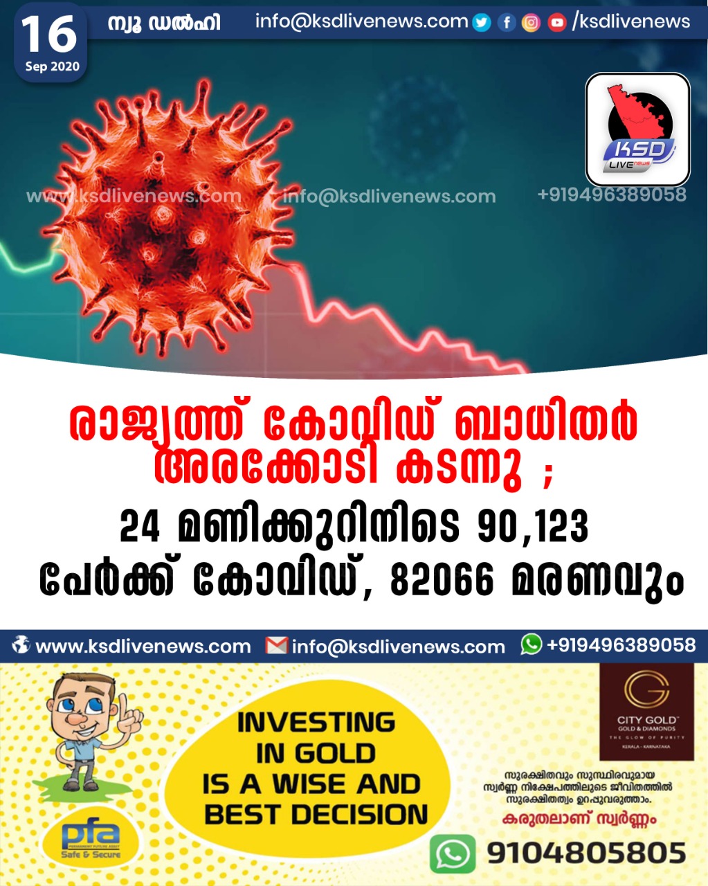 ദേശീയം രാജ്യത്ത് കോവിഡ് ബാധിതര് അരക്കോടി കടന്നു ; 24 മണിക്കുറിനിടെ 90, 123 പേർക്ക് കോവിഡ്, 82066 മരണവുംSeptember 16, 2020
