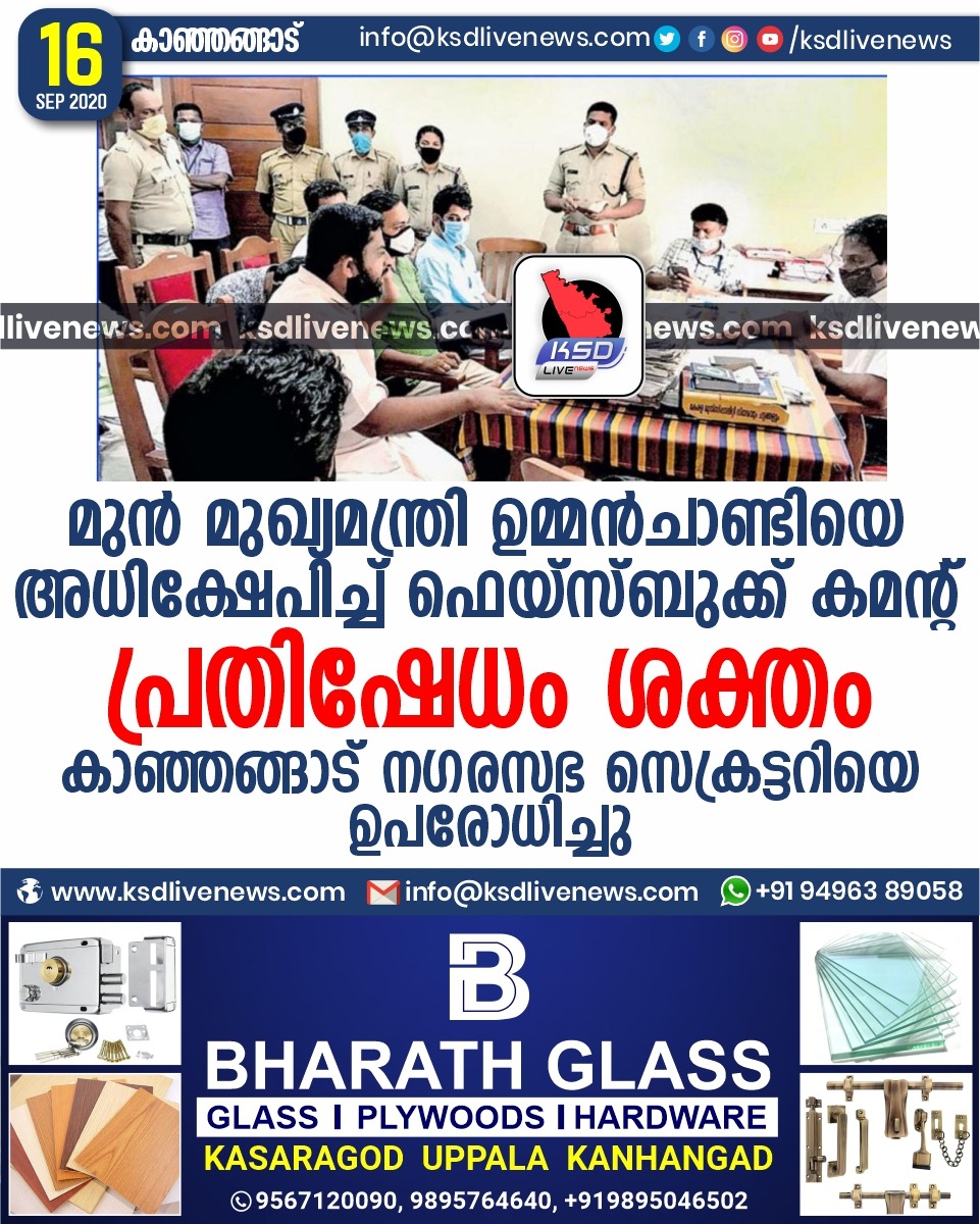 പ്രാദേശികം മുൻ മുഖ്യമന്ത്രി ഉമ്മൻചാണ്ടിയെ അധിക്ഷേപിച്ച് ഫെയ്സ്ബുക്ക് കമന്റ്; പ്രതിഷേധം ശക്തം,കാഞ്ഞങ്ങാട് നഗരസഭ സെക്രട്ടറിയെ ഉപരോധിച്ചുSeptember 16, 2020