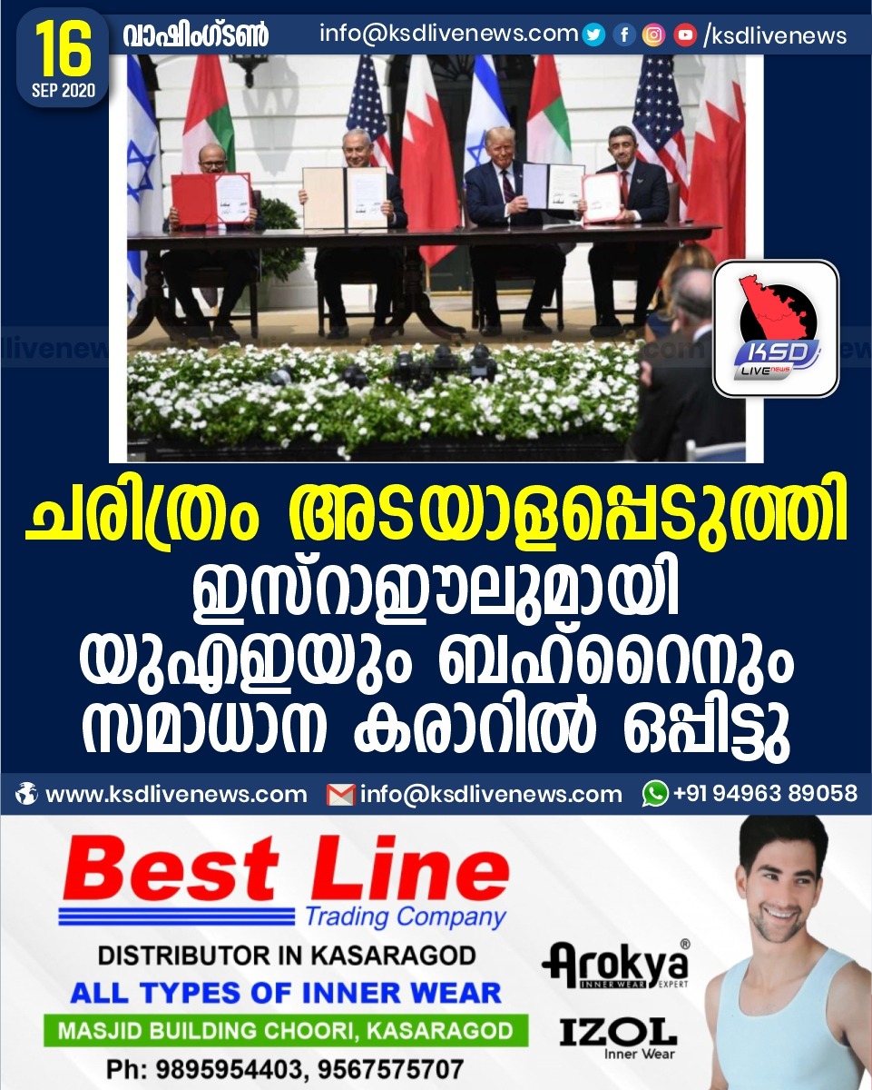 കേരളം ചരിത്രം അടയാളപ്പെടുത്തി ; ഇസ്റാഈലുമായി യുഎഇയും ബഹ്റൈനും സമാധാന കരാറില് ഒപ്പിട്ടുSeptember 16, 2020