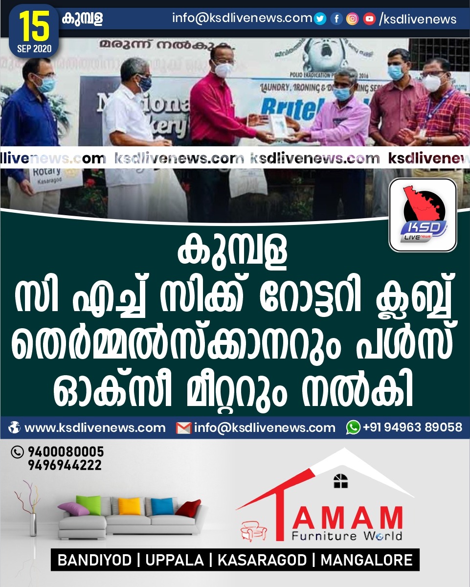 പ്രാദേശികം കുമ്പള സി എച്ച് സിക്ക് റോട്ടറി ക്ലബ്ബ് തെർമ്മൽസ്ക്കാനറും പൾസ് ഓക്സീ മീറ്ററും നൽകിSeptember 15, 2020