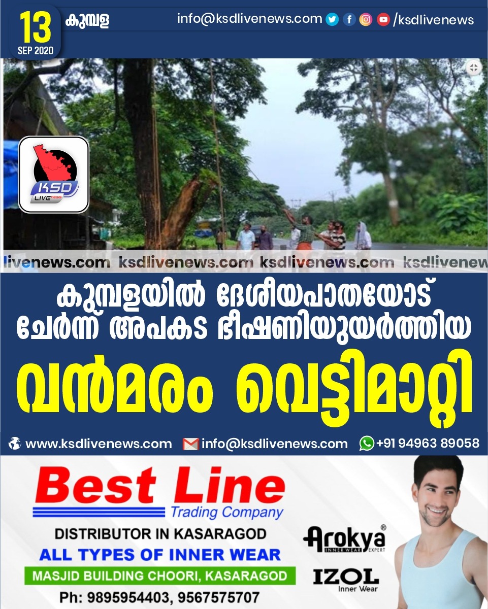 പ്രാദേശികം കുമ്പളയിൽ ദേശീയപാതയോട് ചേർന്ന് അപകട ഭീഷണിയുയര്ത്തിയ വന്മരം വെട്ടിമാറ്റിSeptember 13, 2020