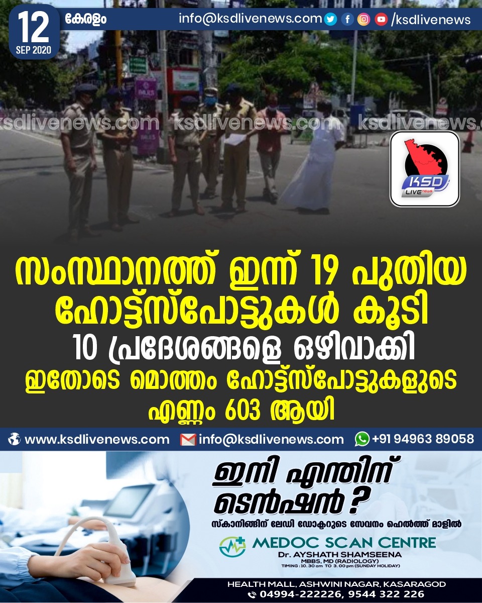 കേരളം സംസ്ഥാനത്ത് ഇന്ന് 19 പുതിയ ഹോട്ട്സ്പോട്ടുകള് കൂടി; 10 പ്രദേശങ്ങളെ ഒഴിവാക്കി.ഇതോടെ മൊത്തം ഹോട്ട്സ്പോട്ടുകളുടെ എണ്ണം 603 ആയി.September 12, 2020