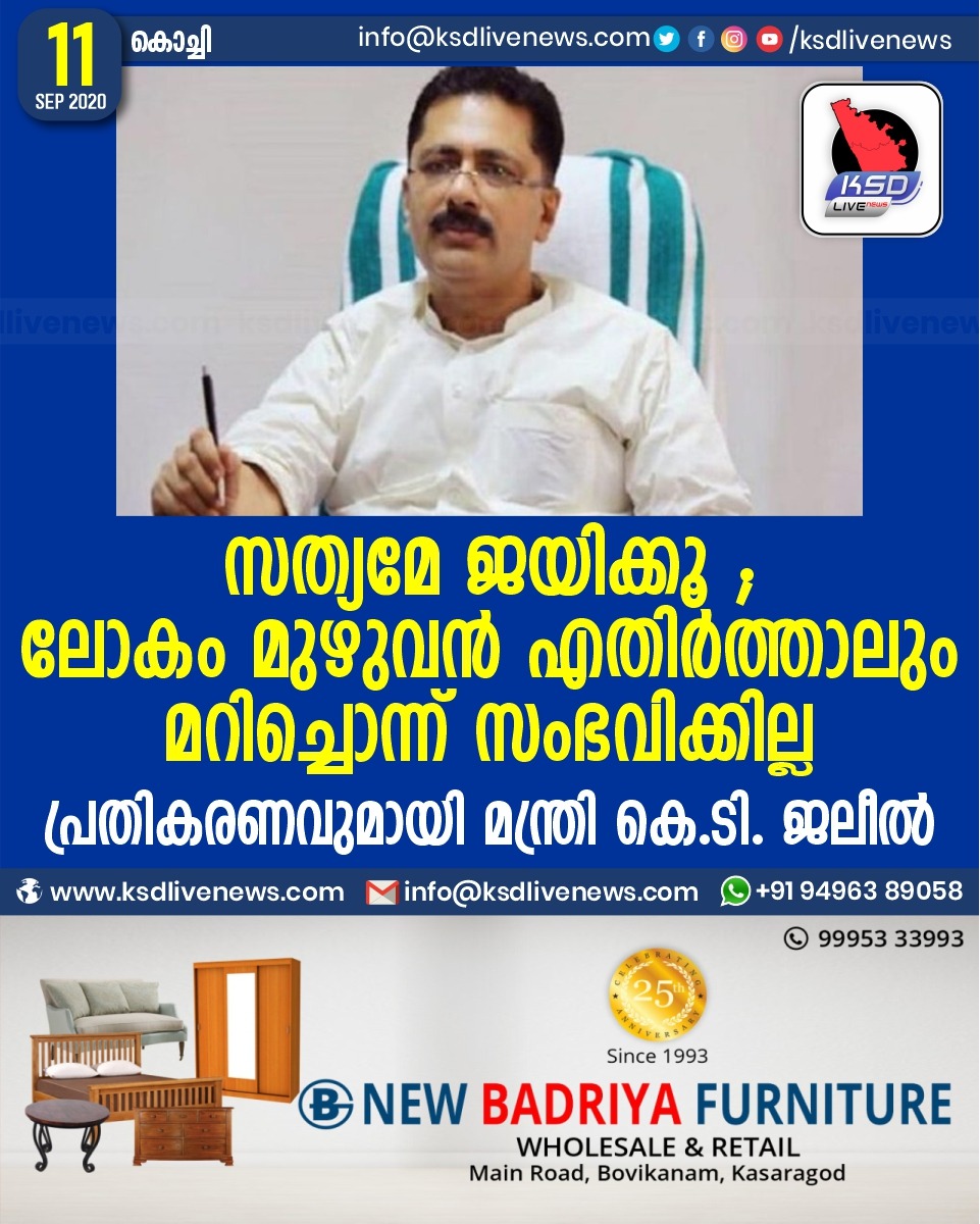 കേരളം സത്യമേ ജയിക്കൂ ; ലോകം മുഴുവൻ എതിർത്താലും മറിച്ചൊന്ന് സംഭവിക്കില്ല : പ്രതികരണവുമായി മന്ത്രി കെ.ടി. ജലീൽSeptember 11, 2020