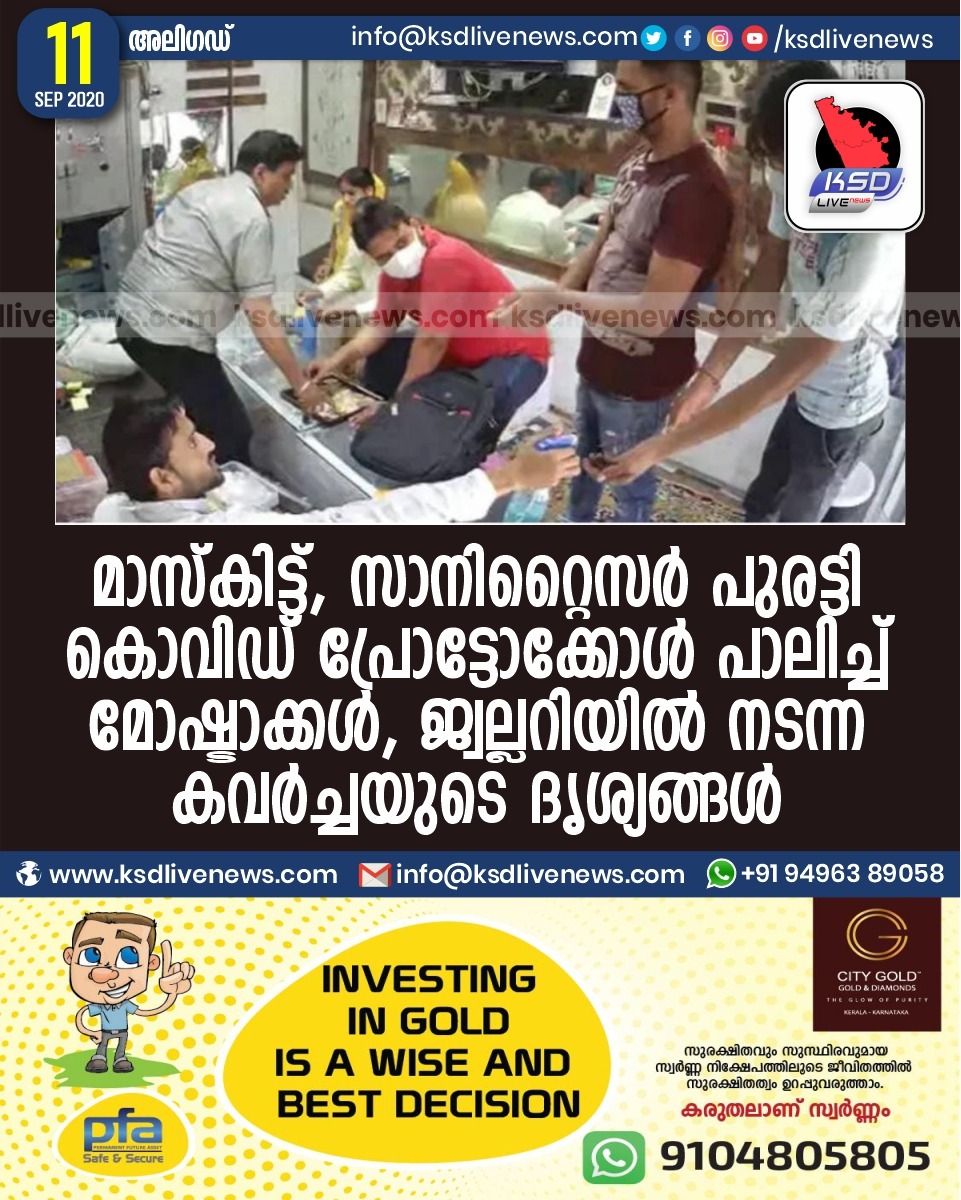 ദേശീയം മാസ്കിട്ട് , സാനിറ്റൈസർ പുരട്ടി കൊവിഡ് പ്രോട്ടോക്കോൾ പാലിച്ച് മോഷ്ടാക്കൾ , ജ്വല്ലറിയിൽ നടന്ന കവർച്ചയുടെ ദൃശ്യങ്ങൾSeptember 11, 2020