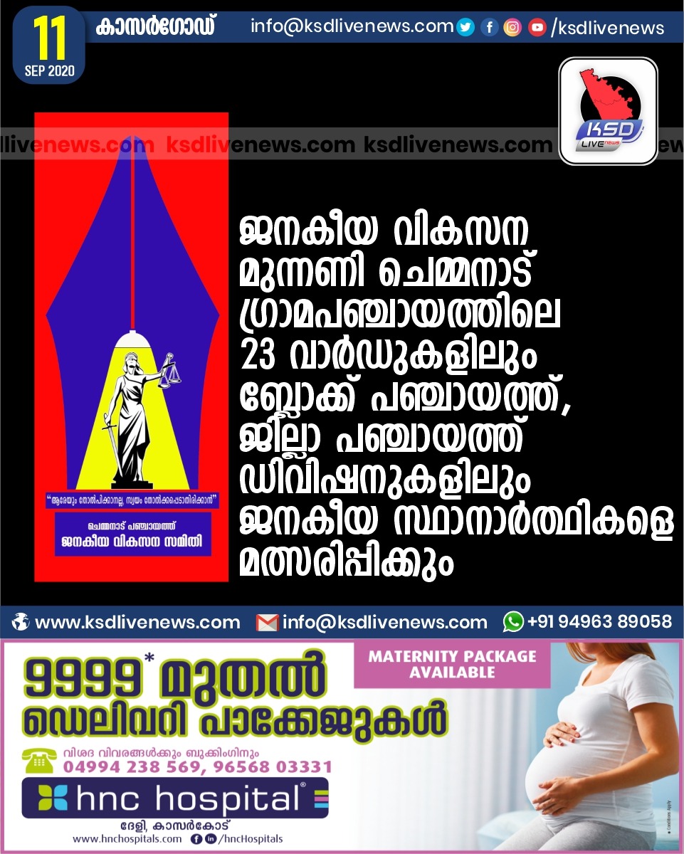 പ്രാദേശികം ജനകീയ വികസന മുന്നണി ചെമ്മനാട് ഗ്രാമപഞ്ചായത്തിലെ 23 വാർഡുകളിലും ബ്ലോക്ക് പഞ്ചായത്ത്, ജില്ലാ പഞ്ചായത്ത് ഡിവിഷനുകളിലും ജനകീയ സ്ഥാനാർത്ഥികളെ മത്സരിപ്പിക്കുംSeptember 11, 2020
