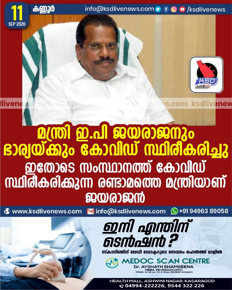 കേരളം മന്ത്രി ഇ.പി ജയരാജനും ഭാര്യയ്ക്കും കോവിഡ് സ്ഥിരീകരിച്ചു ;ഇതോടെ സംസ്ഥാനത്ത് കോവിഡ് സ്ഥിരീകരിക്കുന്ന രണ്ടാമത്തെ മന്ത്രിയാണ് ജയരാജൻSeptember 11, 2020