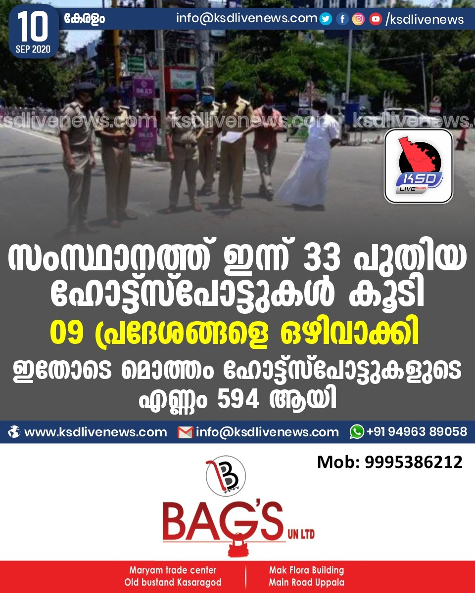 കേരളം സംസ്ഥാനത്ത് ഇന്ന് 33 പുതിയ ഹോട്ട്സ്പോട്ടുകള് കൂടി; 9 പ്രദേശങ്ങളെ ഒഴിവാക്കി.ഇതോടെ മൊത്തം ഹോട്ട്സ്പോട്ടുകളുടെ എണ്ണം 594 ആയി.September 10, 2020