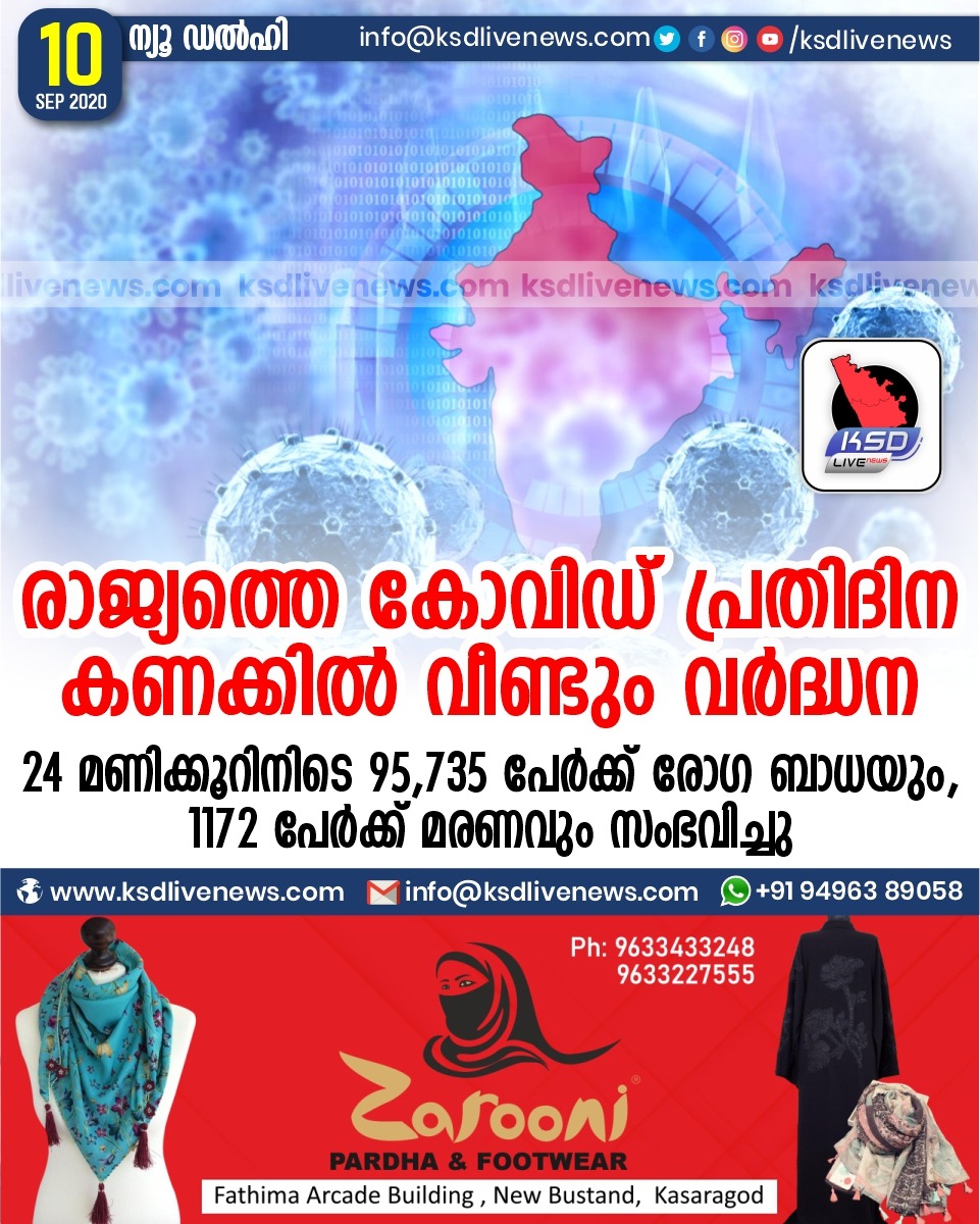 ദേശീയം രാജ്യത്തെ കോവിഡ് പ്രതിദിന കണക്കിൽ വീണ്ടും വർദ്ധന ;24 മണിക്കൂറിനിടെ 95,735 പേർക്ക് രോഗ ബാധയും, 1172 പേർക്ക് മരണവും സംഭവിച്ചുSeptember 10, 2020