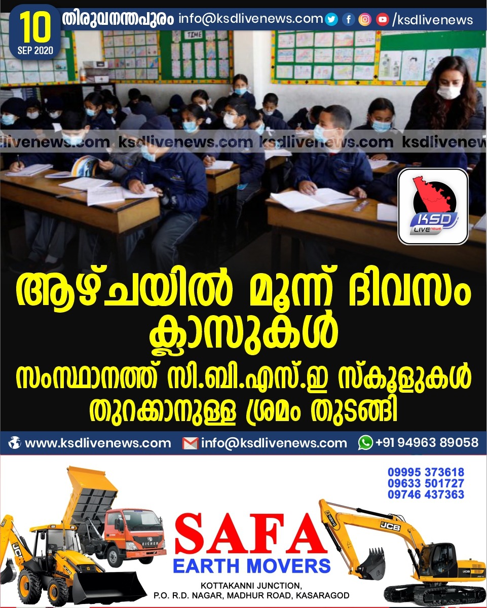 കേരളം ആഴ്ചയിൽ മൂന്ന് ദിവസം ക്ലാസുകൾ ; സംസ്ഥാനത്ത് സി.ബി.എസ്.ഇ സ്കൂളുകൾ തുറക്കാനുള്ള ശ്രമം തുടങ്ങിSeptember 10, 2020